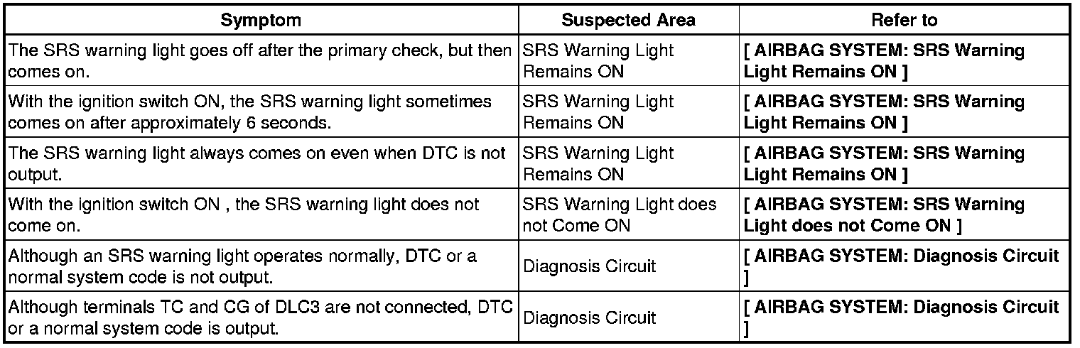 SUPPLEMENTAL RESTRAINT SYSTEMS: AIRBAG SYSTEM: PROBLEM SYMPTOMS TABLE