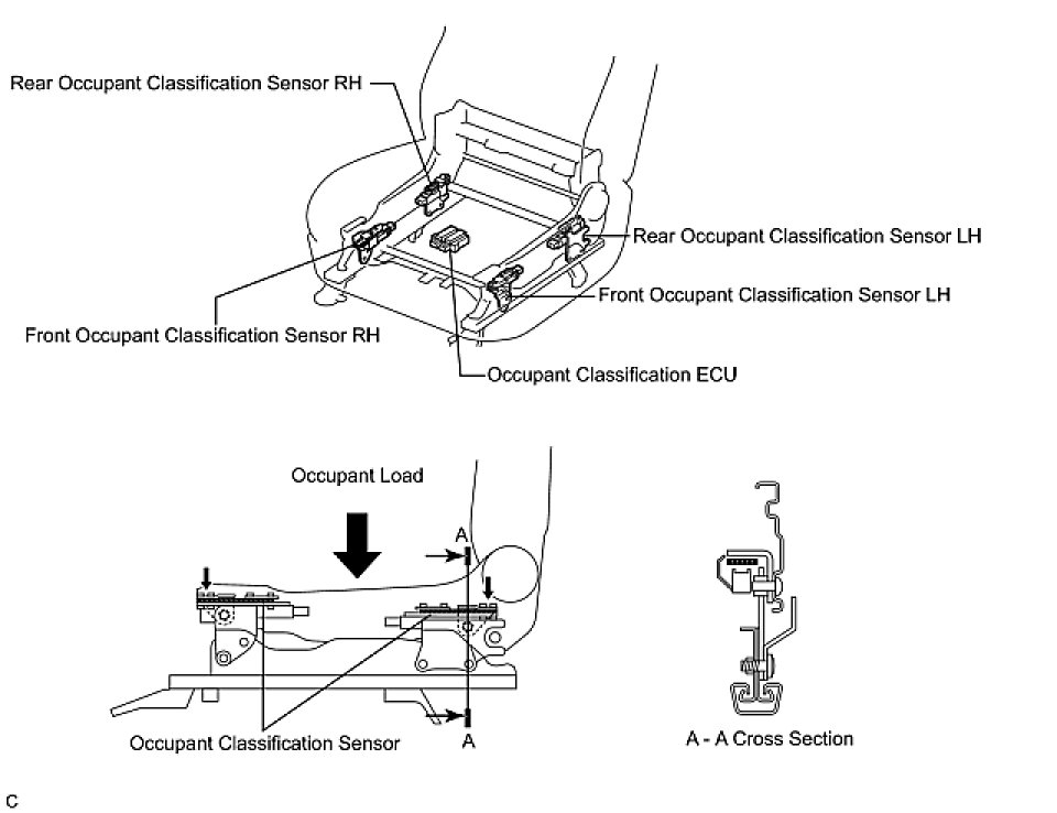 (a) The occupant detection sensors are installed on 4 brackets, which connect the seat rail and the seat frame. The resistance values of these sensors, which vary in accordance with the load that acts on the brackets, are transmitted to the occupant classification ECU as signals. Upon receipt of the signals, the ECU determines the front passenger seat occupant conditions.