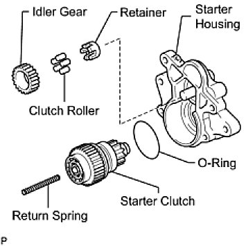 (b) Remove the return spring, idler gear, clutch roller, retainer, O-ring and starter clutch from the starter housing.
