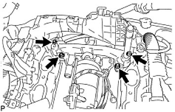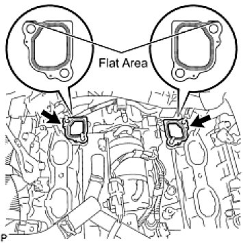 HINT: With the flat-bottom of each new gasket facing downward as shown in the illustration, install the 2 gaskets to the engine rear side.