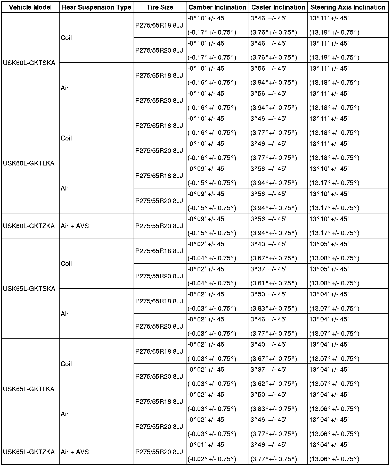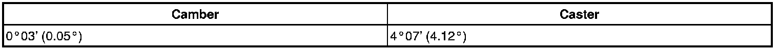 Standard Camber, Caster, Steering Axis Inclination (Unloaded Vehicle):