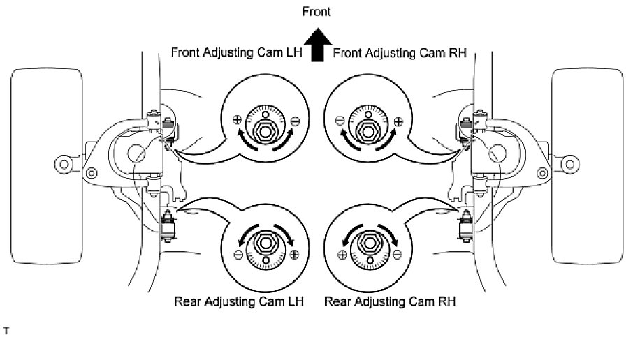 (b) Turn the toe adjusting cam and camber adjusting cam in both directions, and adjust the camber and caster to the center value.