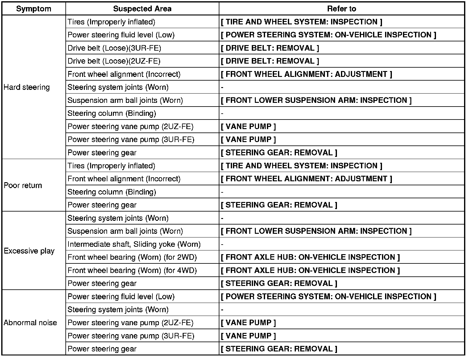 PROBLEM SYMPTOMS TABLE