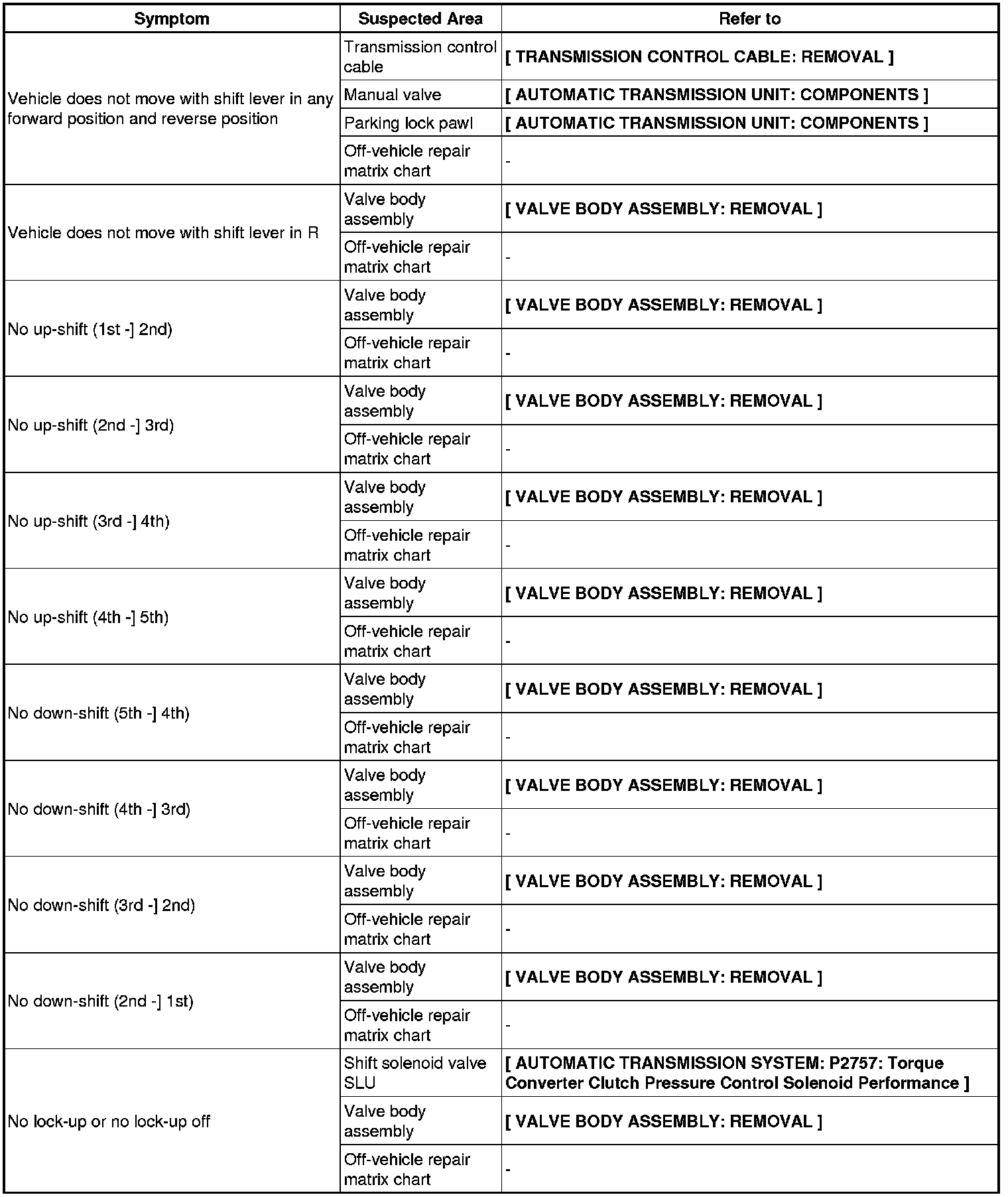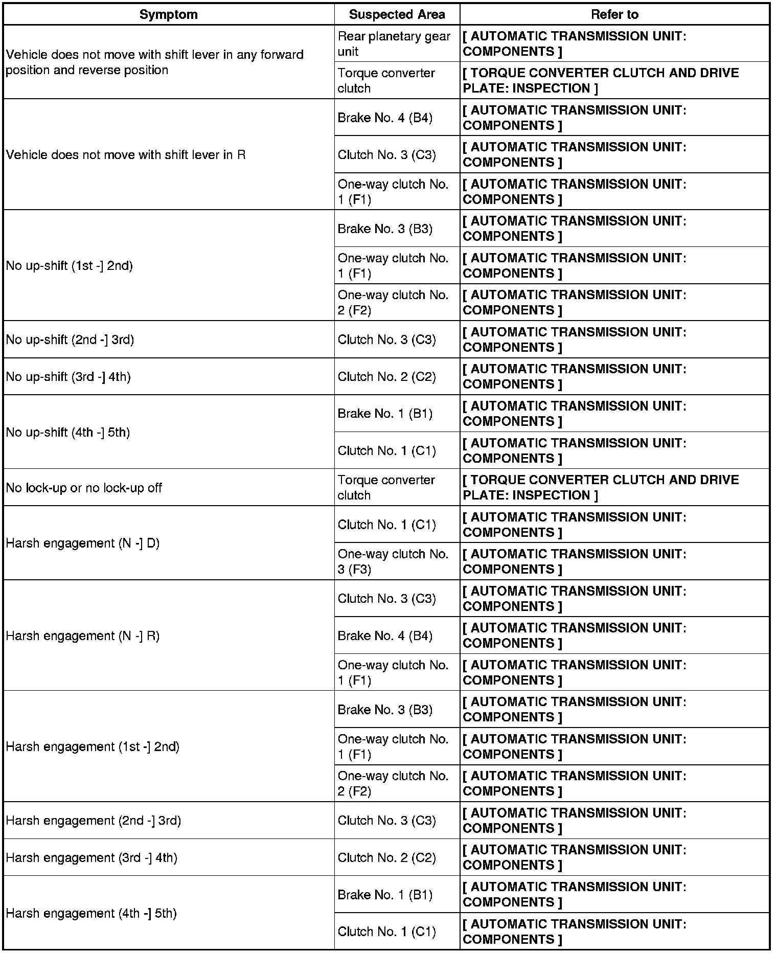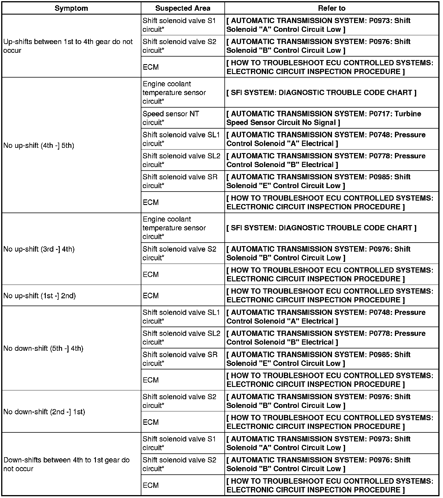 A750E AUTOMATIC TRANSMISSION / TRANSAXLE: AUTOMATIC TRANSMISSION SYSTEM: PROBLEM SYMPTOMS TABLE