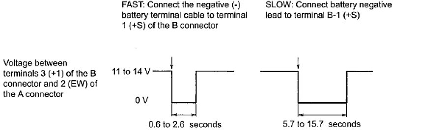 (2) Connect the positive (+) battery lead to terminal 2 (+B) of the B connector and the negative (-) battery lead to terminals 1 (+S) of the B connector and 2 (EW) of the A connector.
