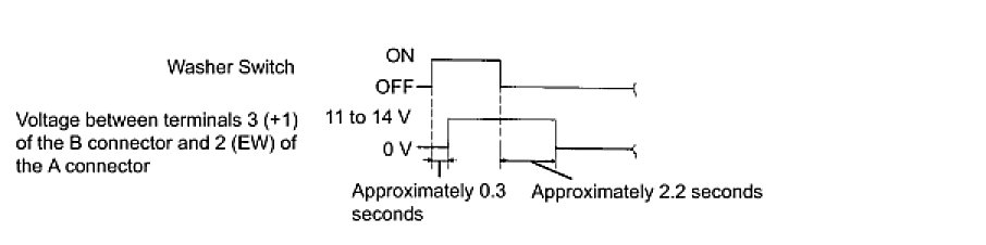 (3) Connect the positive (+) voltmeter terminal to terminal 3 (+1) of the B connector and the negative (-) voltmeter terminal to terminal 2 (EW) of the A connector. Turn the washer switch on and off, and check the voltage between terminals 3 (+1) of the B connector and 2 (EW) of the A connector.
