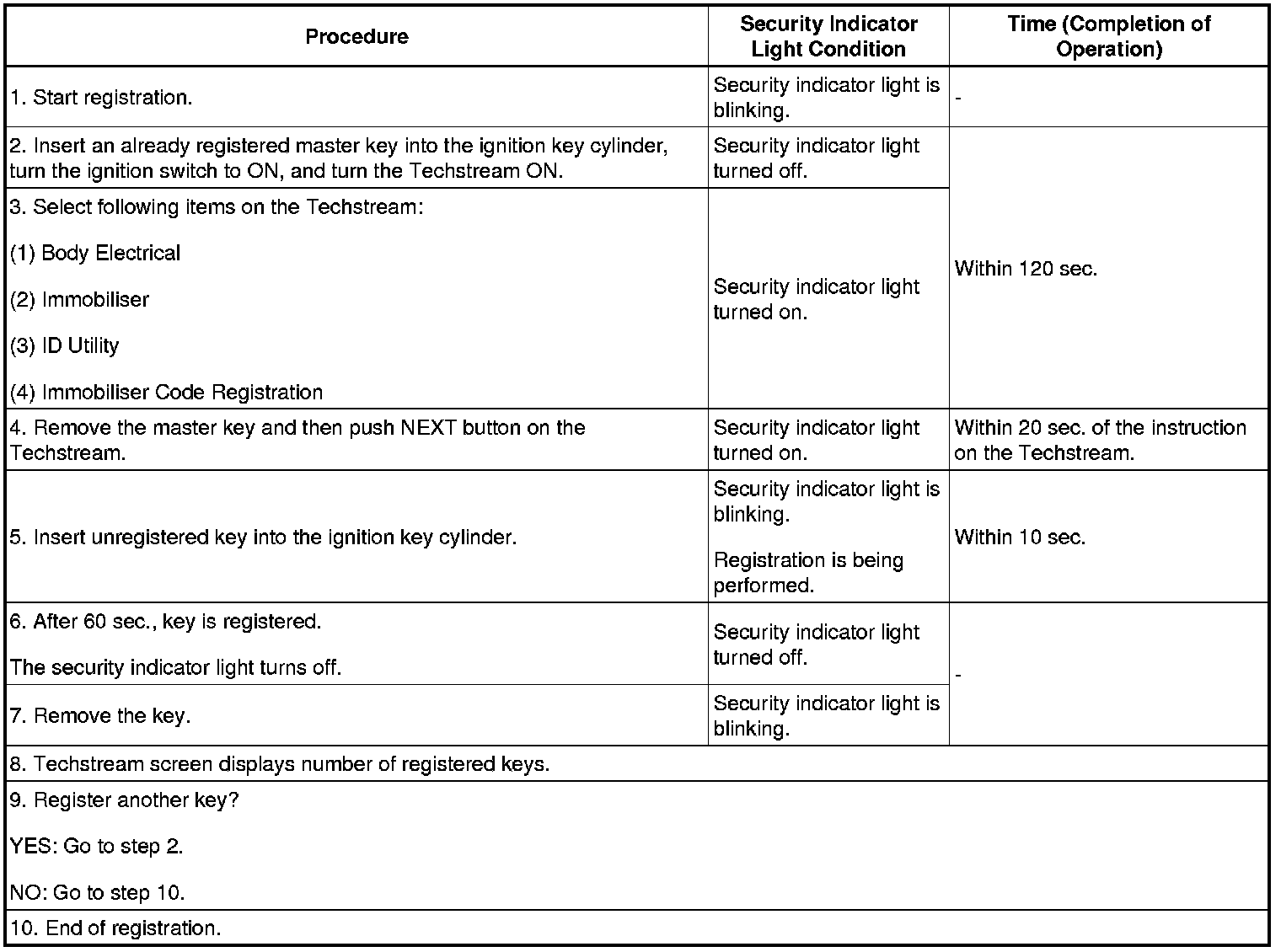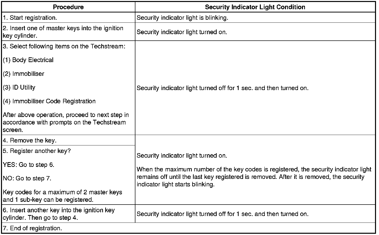 - A brief outline of the procedures for key code registration is shown above. For more detailed information, refer to the screen of the Techstream.