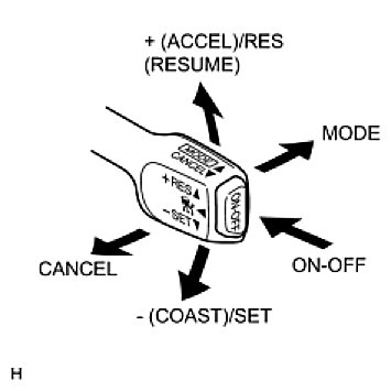 The cruise control main switch operates 8 functions: SET, - (COAST), TAP-DOWN, RES (RESUME), + (ACCEL), TAP-UP, CANCEL, and MODE. The SET, TAP-DOWN, and - (COAST) functions, and the RES (RESUME), TAP-UP, and + (ACCEL) functions are operated with the same switch. The cruise control main switch is an automatic return type switch which turns on only while operating it in the direction of each arrow and turns off after releasing it. The internal contact point of the cruise control main switch is turned on with the switch operation. The ECM then reads the voltage value that has been changed by the switch operation to control MODE, SET, - (COAST), RES (RESUME), + (ACCEL), and CANCEL. The dynamic laser cruise control system has two cruise control modes: the constant speed control mode and vehicle-to-vehicle distance control mode.