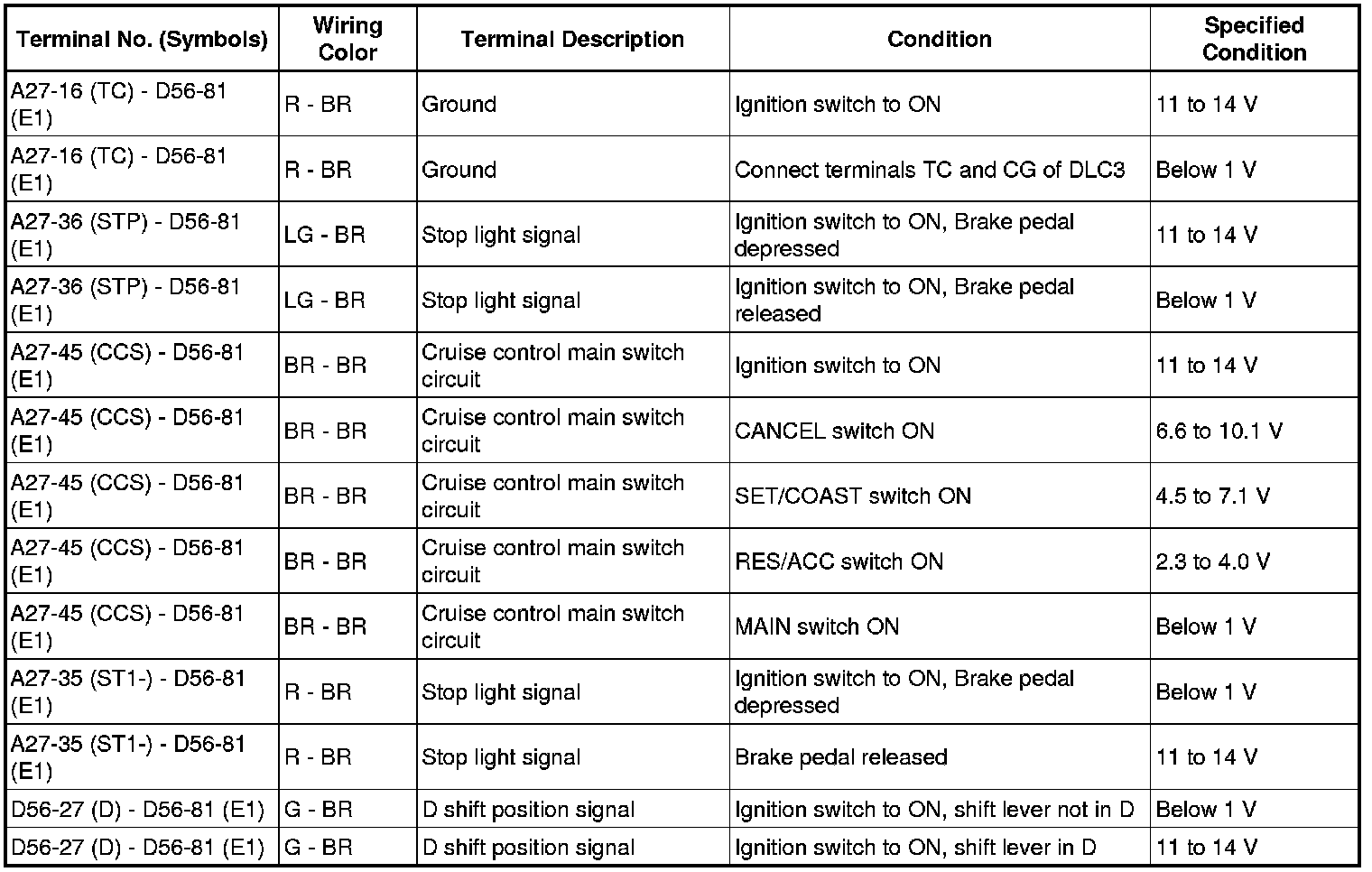 HINT: The standard normal voltage between each pair of ECM terminals is shown in the table below. The appropriate conditions for checking each pair of terminals are also indicated. The result of checks should be compared with the standard normal voltage for that pair of terminals, displayed in the Specified Condition column. The illustration above can be used as a reference to identify the ECM terminal locations.