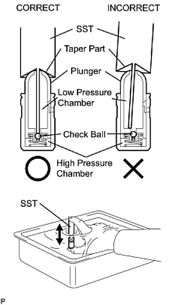 NOTE: When bleeding high-pressure air from the compression chamber, make sure that the tip of SST is actually pressing the check ball as shown in the illustration. If the check ball is not pressed, air will not bleed.