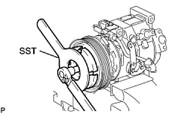 (f) Using SST, hold the magnet clutch hub and install the bolt.
