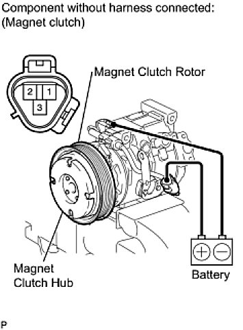 (1) Confirm that the magnet clutch hub and magnet clutch rotor lock when the battery positive lead is connected to terminal 3 of the magnet clutch, and the negative lead is connected to the ground wire.