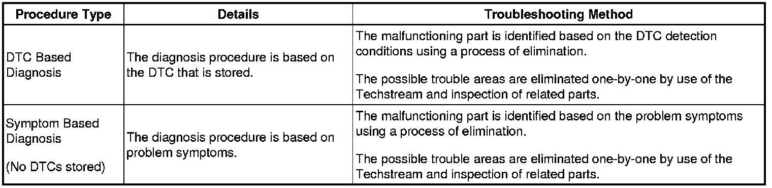 - The troubleshooting procedures consist of diagnosis procedures for when a DTC is stored and diagnosis procedures for when no DTC is stored. The basic idea is explained in the following table.