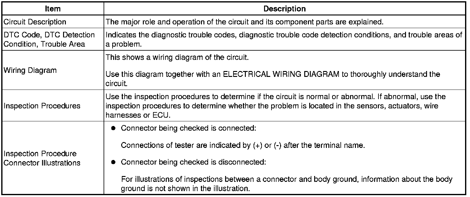 Look for output Diagnostic Trouble Codes (DTCs) (from the DTC checks) in the appropriate section's Diagnostic Trouble Code Chart. Use the chart to determine the trouble area and the proper inspection procedure. A description of each of the chart's columns is below.