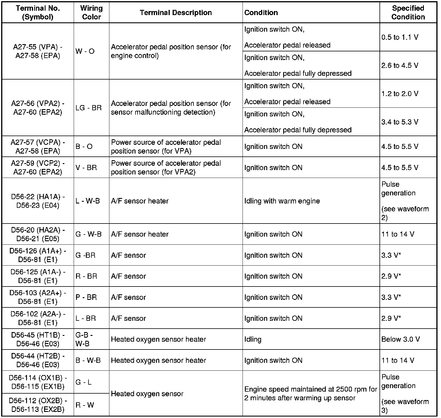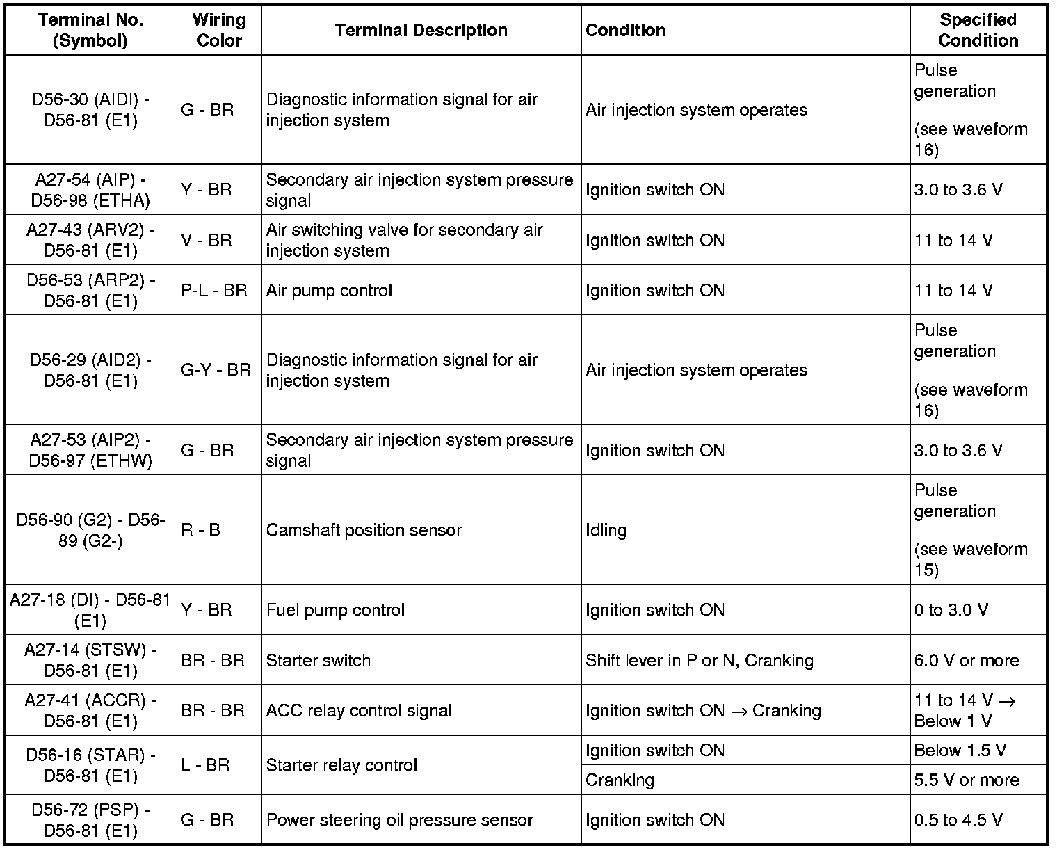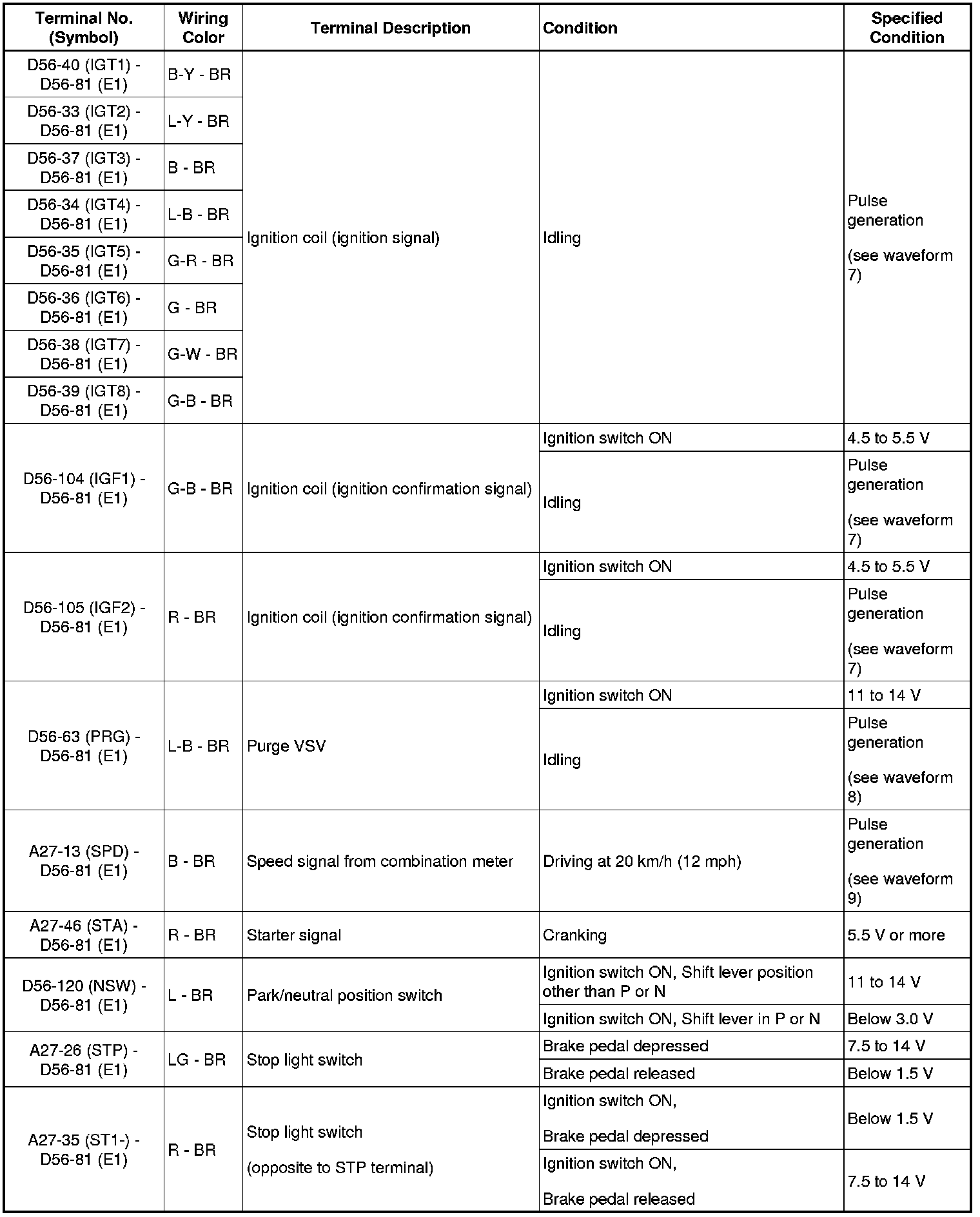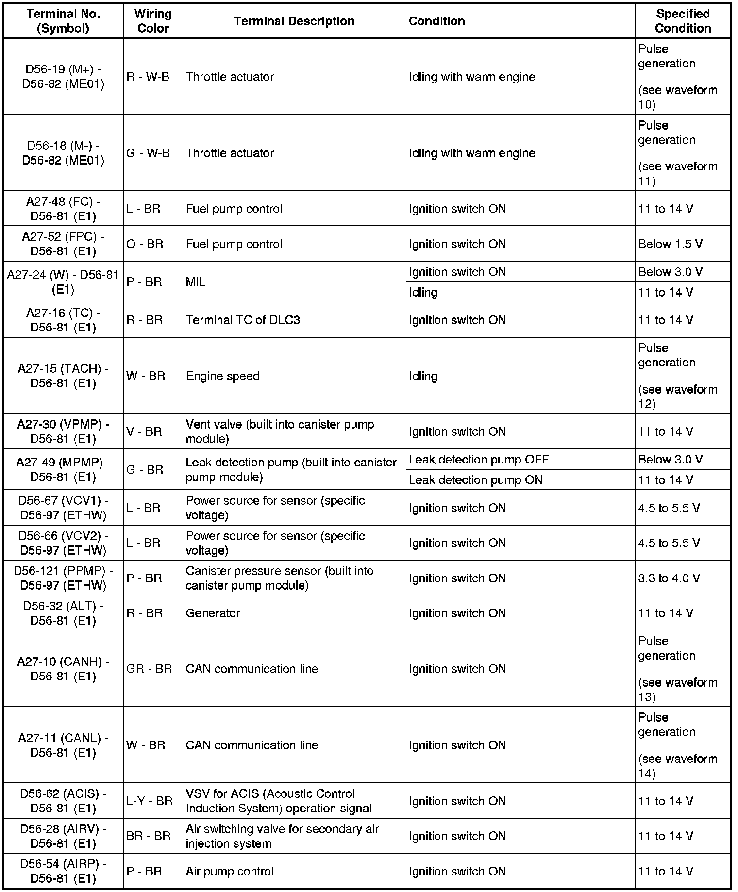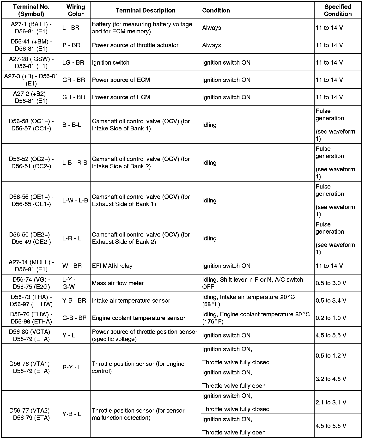 HINT: The standard normal voltage between each pair of ECM terminals is shown in the table below. The appropriate conditions for checking each pair of terminals are also indicated. The result of checks should be compared with the standard normal voltage for that pair of terminals, displayed in the Specified Condition column. The illustration above can be used as a reference to identify the ECM terminal locations.