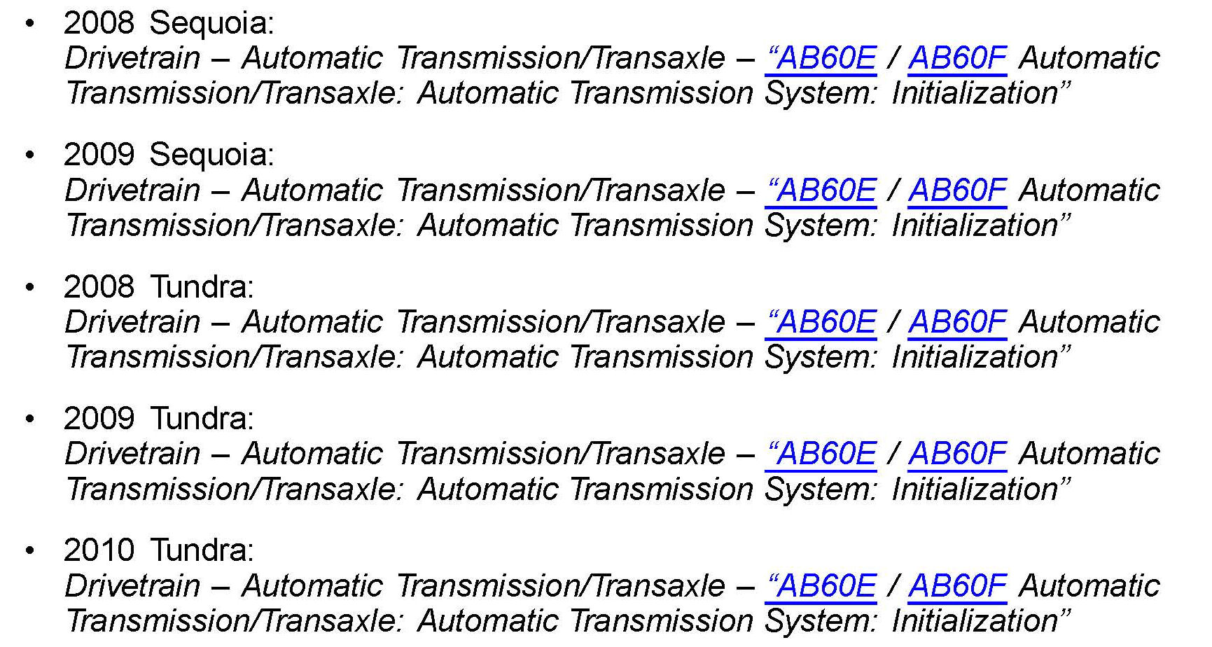 Some Sequoia or Tundra vehicles with AB60 (6 speed) transmissions may exhibit transmission slipping MIL "ON" with transmission shift performance DTCs such as P2714, P0751, P0756, P0761, P0766, P0729, P0781, P0894, or P0776, or harsh shifting due to damage to the C1 clutch assembly. Installation of revised Engine Control Module/ECM (SAE term: Powertrain Control Module/PCM) software logic may be required to repair the vehicle. Follow the repair procedure in this bulletin to address customer concerns.