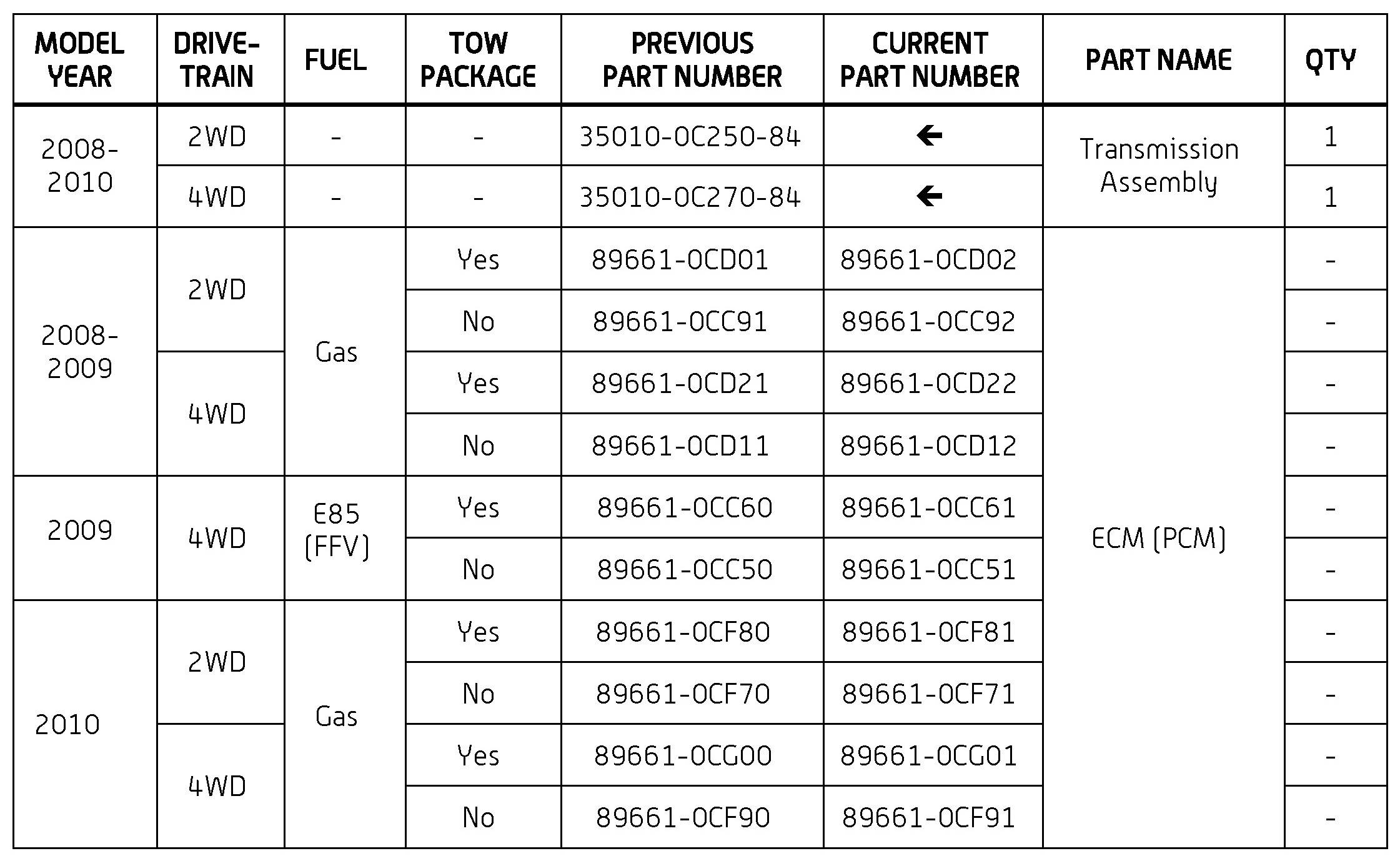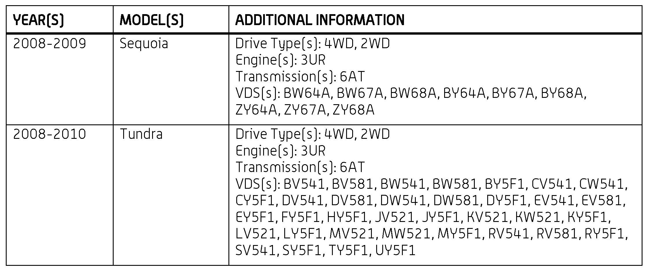 - Applicability has been updated to include 2008 - 2009 model year Sequoia and 2007 - 2009 model year Tundra vehicles.
