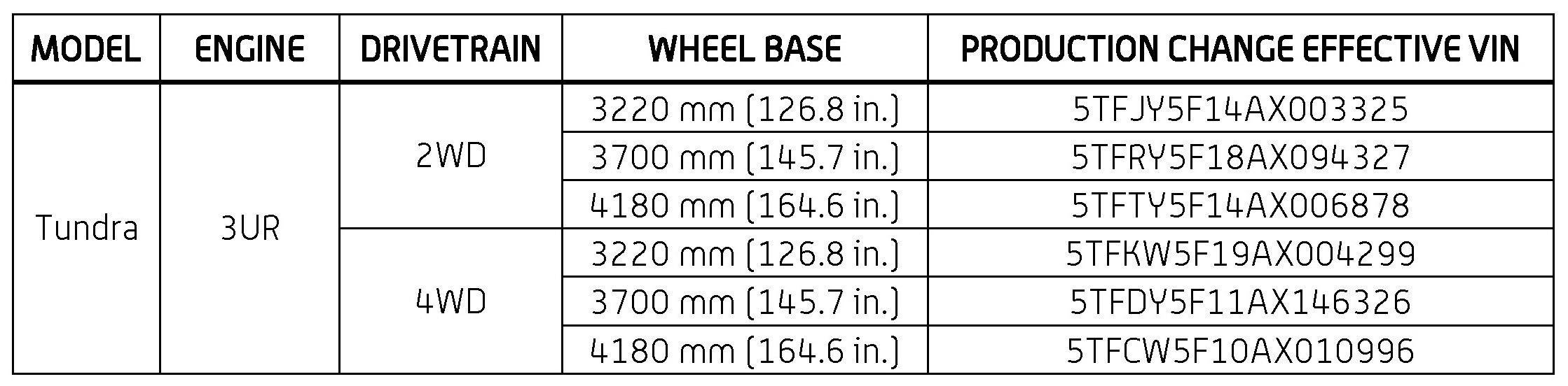 - August 2, 2010 Applicability has been updated to include 2010 model year Tundra vehicles.