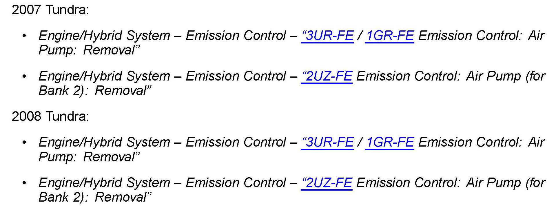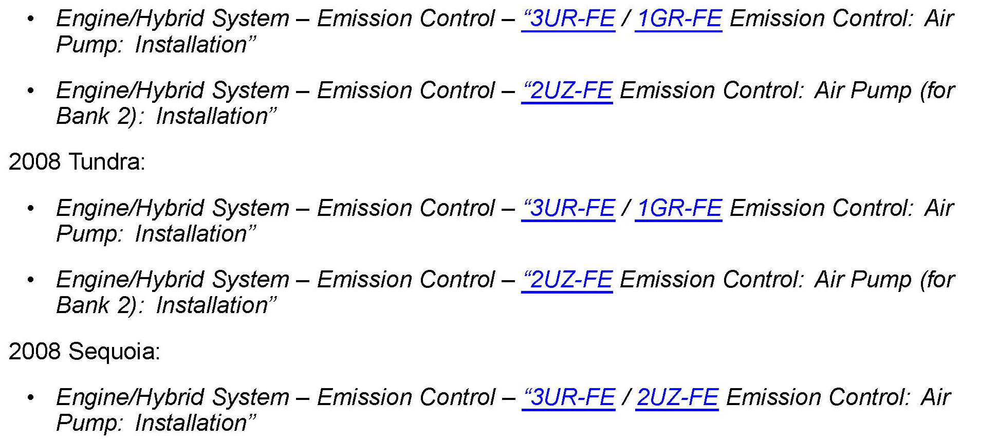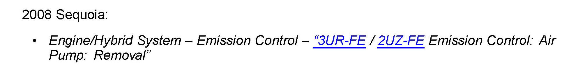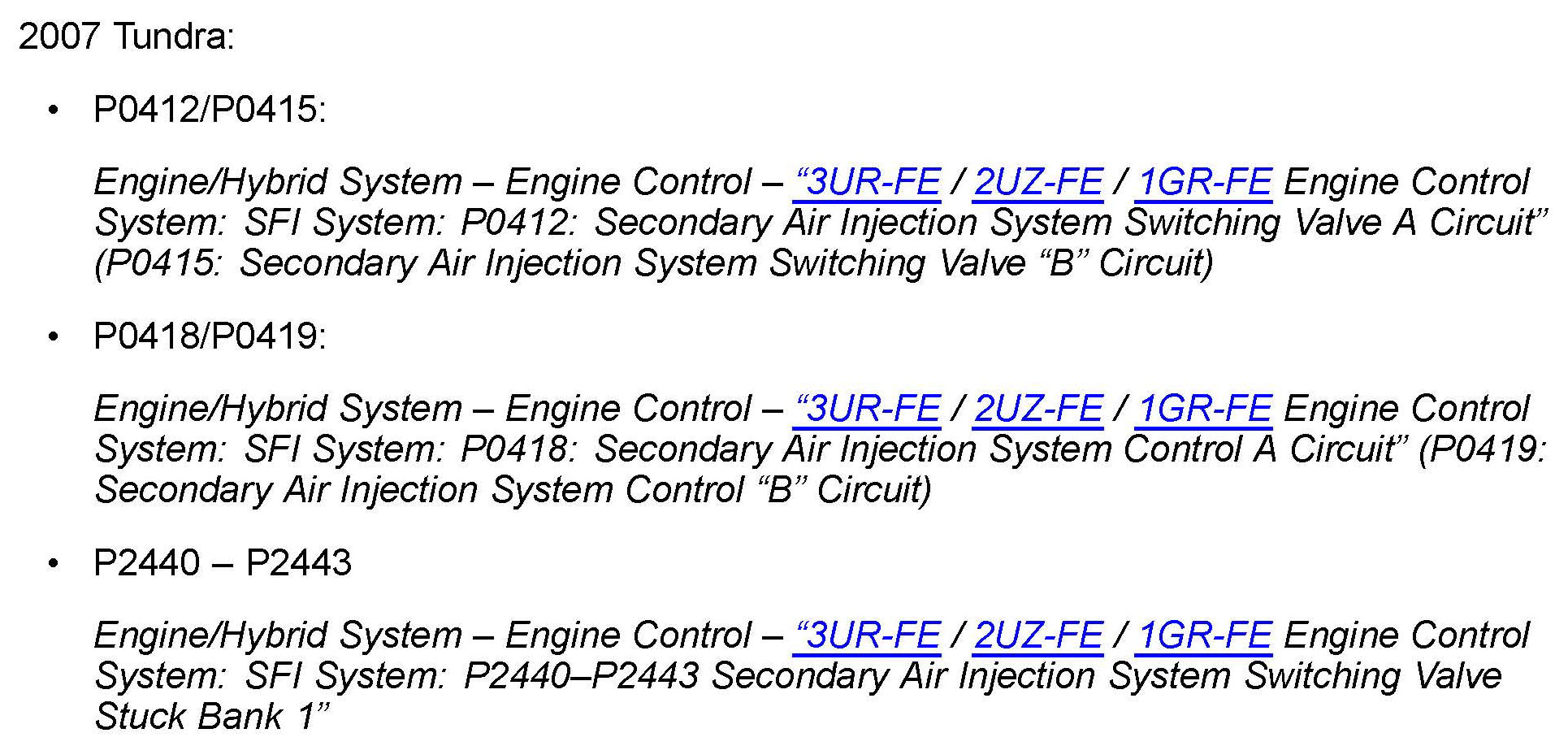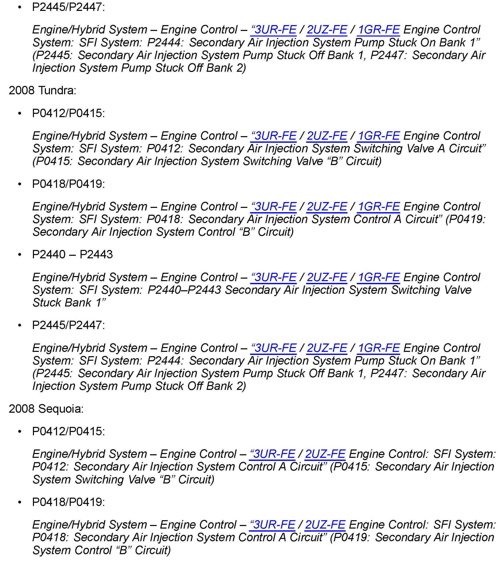 Some 2007 - 2008 model year Tundra and 2008 model year Sequoia vehicles may exhibit a MIL "ON" condition with Diagnostic Trouble Codes (DTCs) P0418, P0419, P2440, P2441, P2442, P2443, P2445, and/or P2447. This concern may be caused by water intrusion into the air injection pump assemblies. Use the following procedure to address this condition.