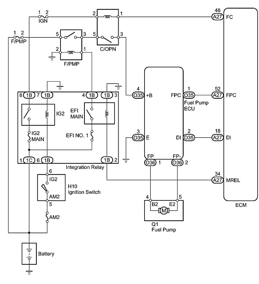 The fuel pump circuit consists of the ECM, fuel pump and fuel pump ECU (which operates the fuel pump). Based on the engine output, the ECM determines the fuel pump speed. The speed is then converted to a duty signal and sent to the fuel pump ECU. Based on the signal sent from the ECM, the fuel pump ECU adjusts the fuel pump operation speed between 3 settings.