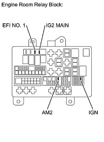 (a) Remove the AM2 fuse, IG2 MAIN fuse, EFI NO. 1 fuse and IGN fuse from the engine room relay block.