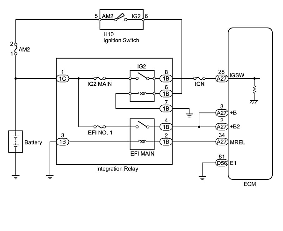 When the ignition switch is turned to ON, the battery voltage is applied to the IGSW of the ECM. The output signal from the MREL terminal of the ECM causes a current to flow to the coil, closing the contacts of the integration relay (EFI MAIN relay) and supplying power to either terminal +B or +B2 of the ECM.