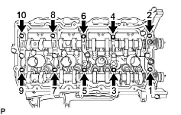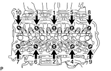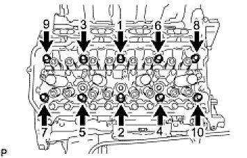 - Using a 10 mm bi-hexagon wrench, install and uniformly tighten the 10 cylinder head bolts with the plate washers in several steps, in the sequence shown in the illustration.