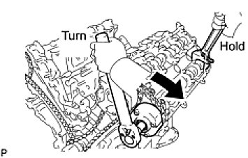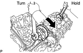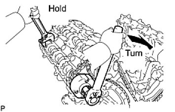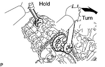- Using a wrench to hold the hexagonal portion of the No. 1 camshaft, tighten the camshaft timing gear with the bolt.