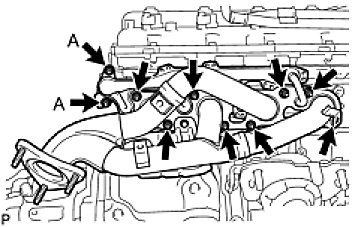 Temporarily install the exhaust manifold with the 2 nuts labeled A and 8 new nuts.