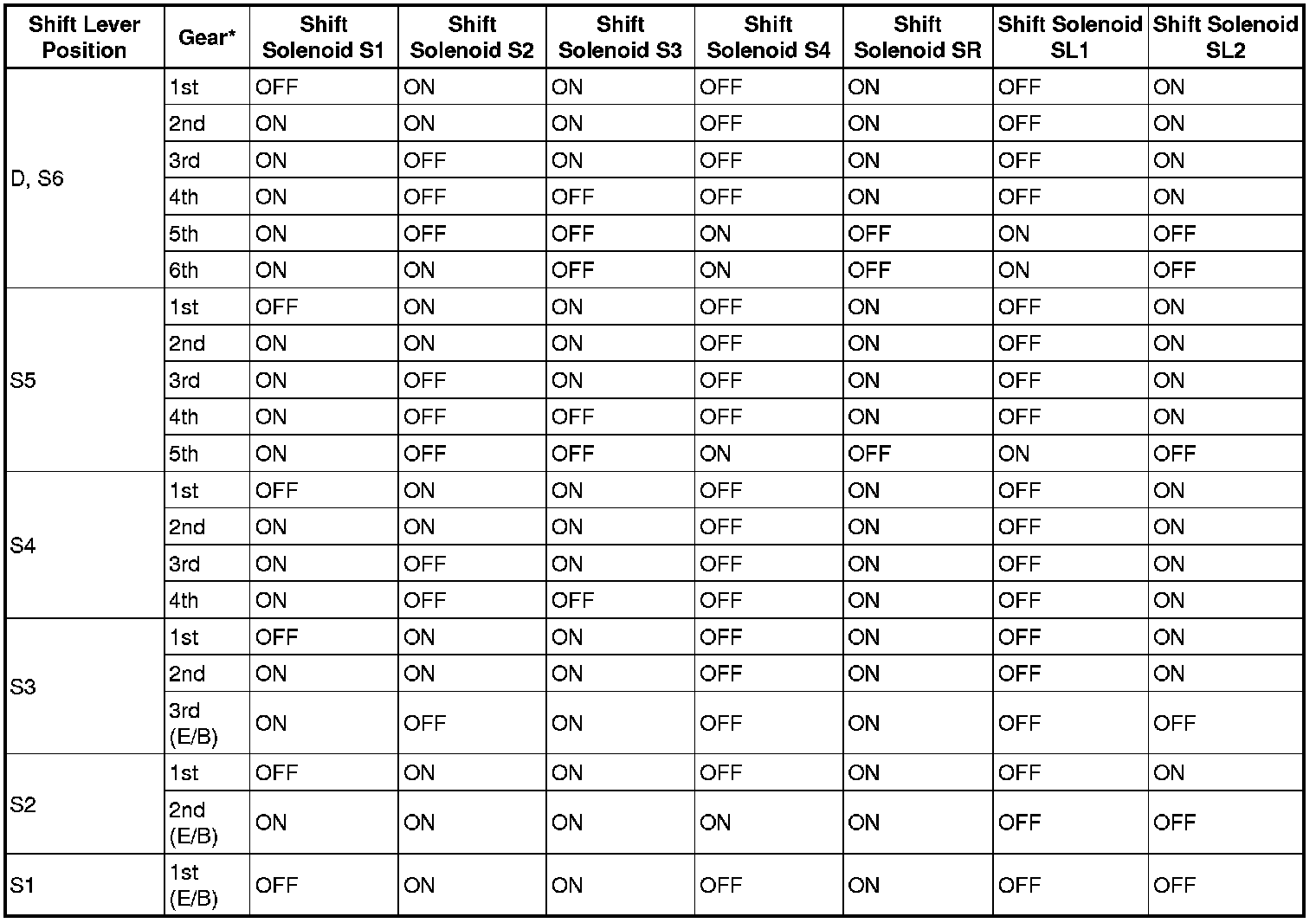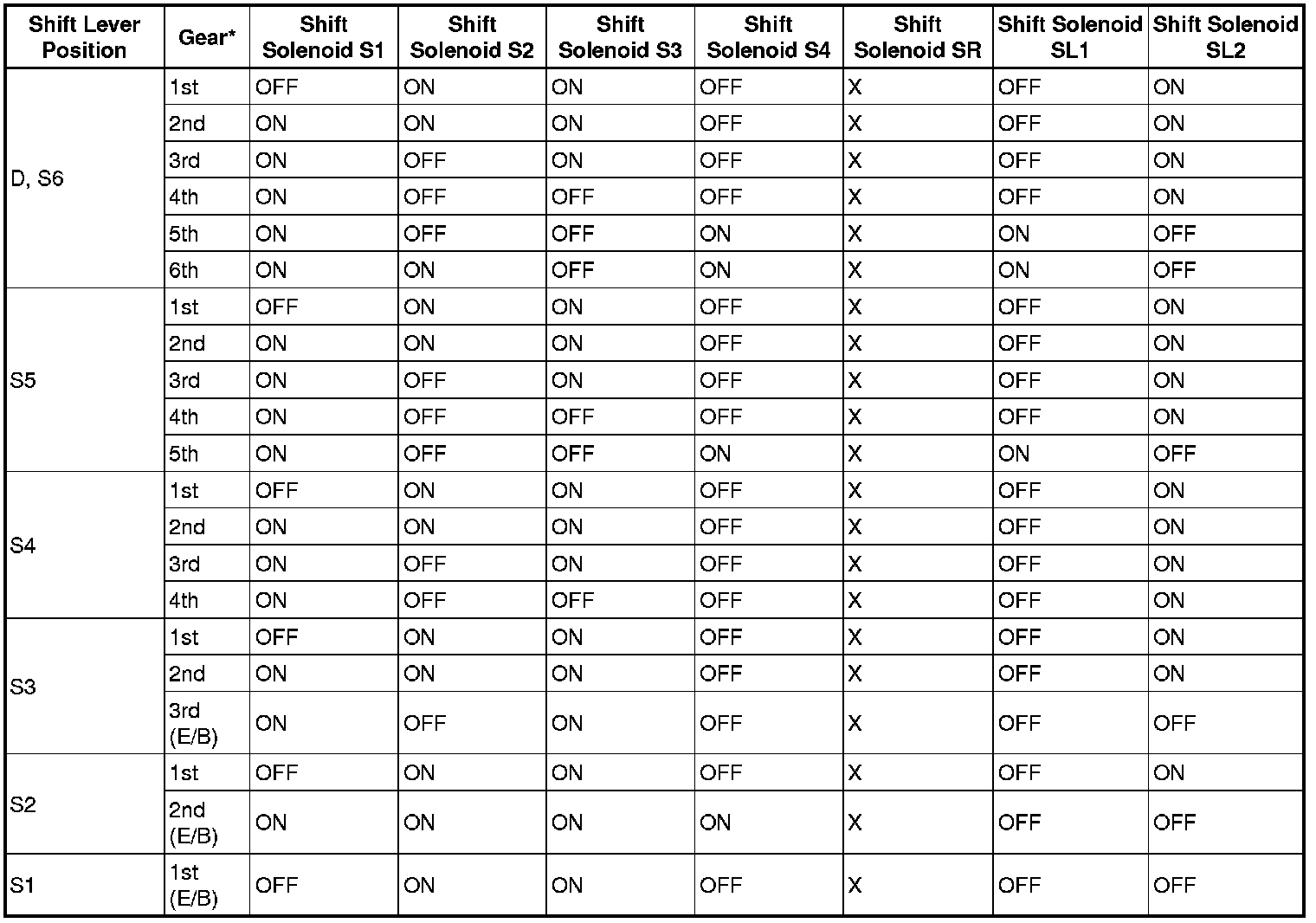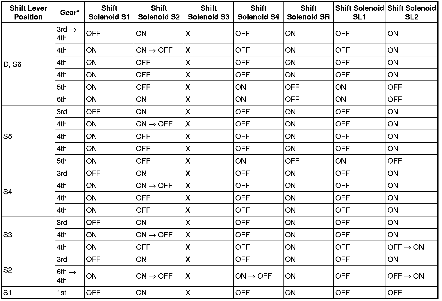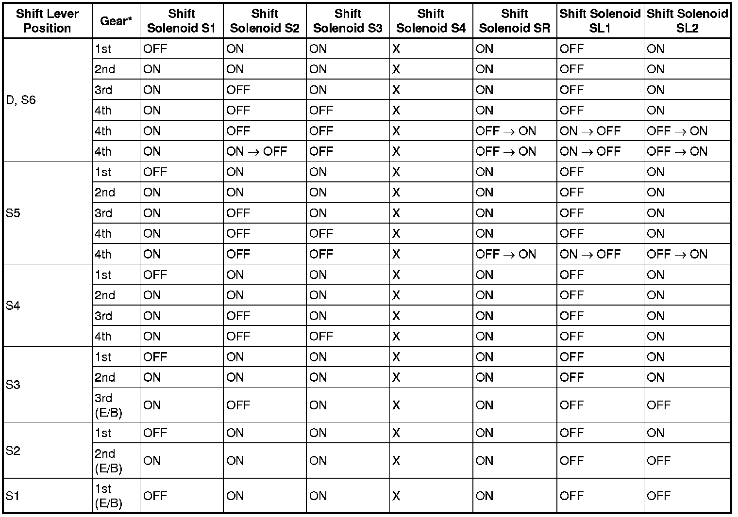 If any of the shift solenoid valve circuits has an open or short failure, the ECM turns the other shift solenoids "ON" and "OFF" in order to shift into the gear positions shown in the table below. Also, the ECM stops sending current to the open or short circuited solenoid.
