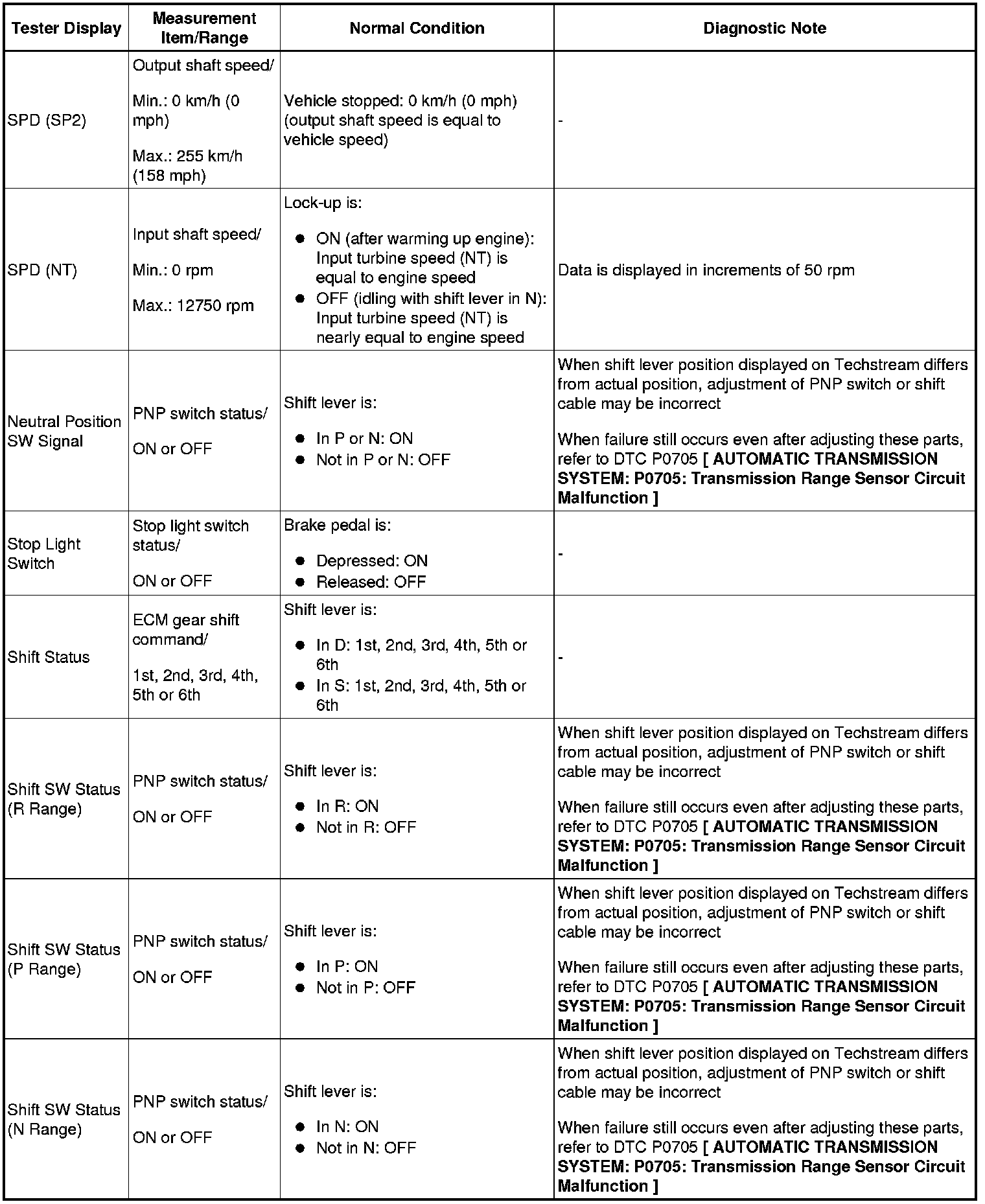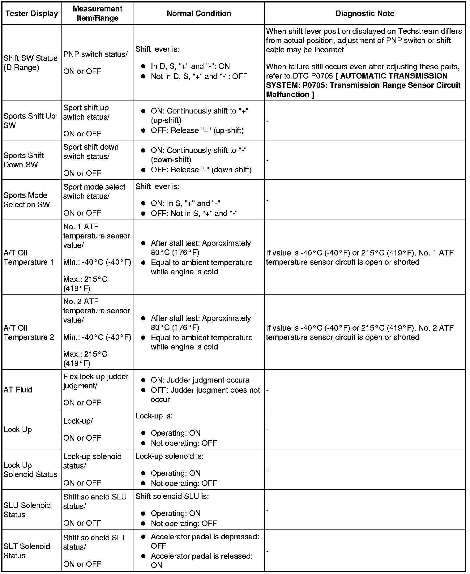 HINT: Using the Techstream to read the Data List allows the values or states of switches, sensors, actuators and other items to be read without removing any parts. This non-intrusive inspection can be very useful because intermittent conditions or signals may be discovered before parts or wiring is disturbed. Reading the Data List information early in troubleshooting is one way to save diagnostic time.