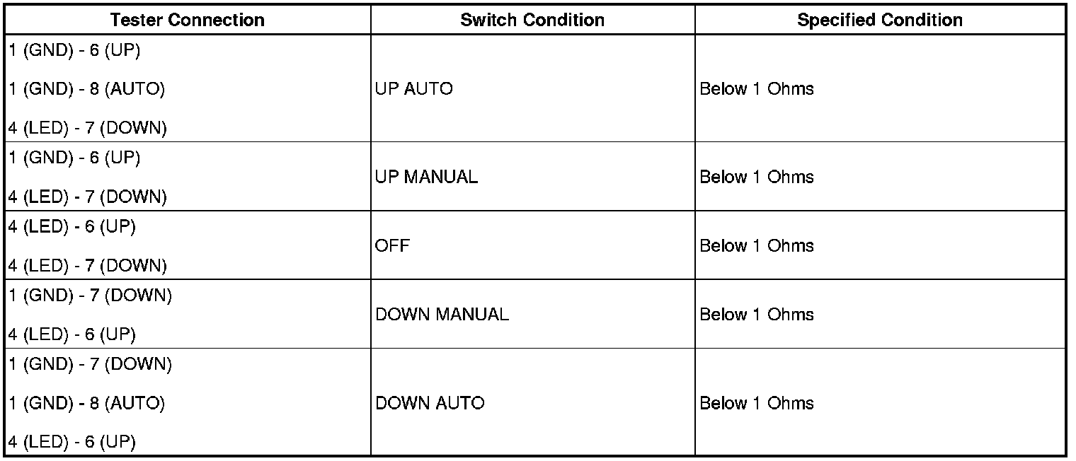 If the result is not as specified, replace the power window regulator switch.