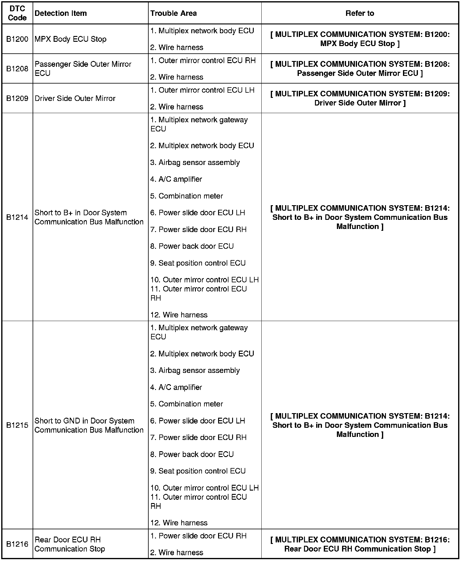 MULTIPLEX COMMUNICATION: MULTIPLEX COMMUNICATION SYSTEM: DIAGNOSTIC TROUBLE CODE CHART