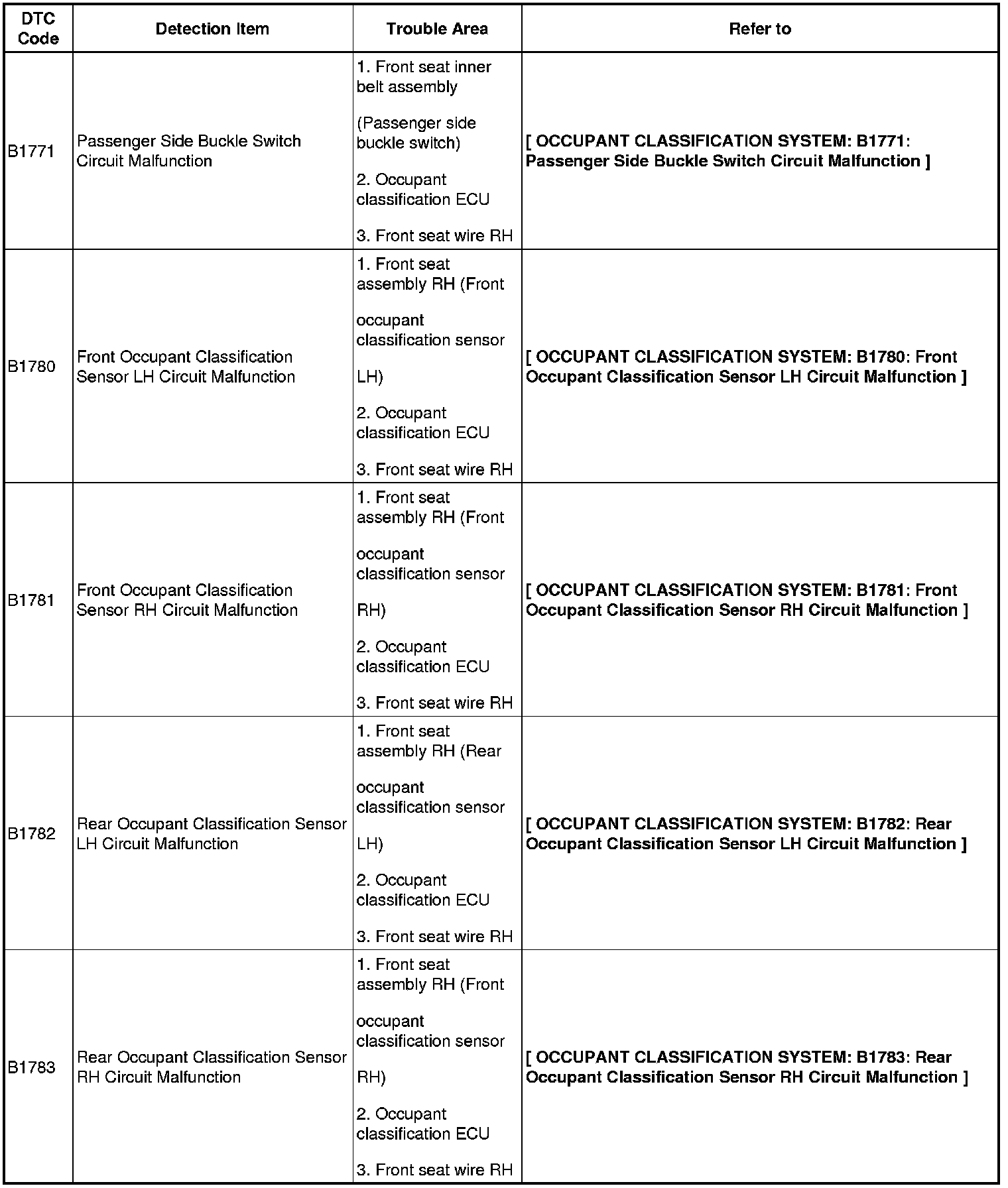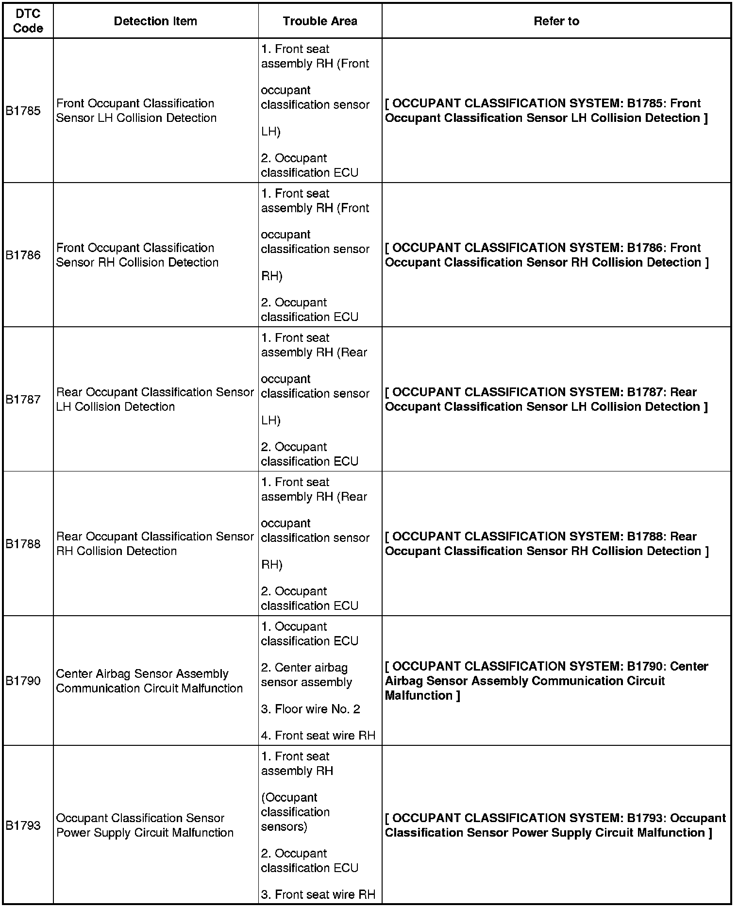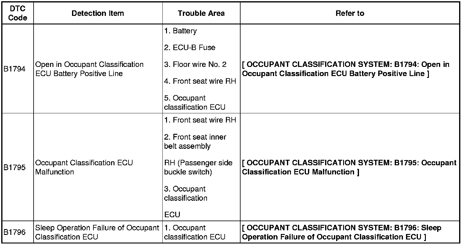 SUPPLEMENTAL RESTRAINT SYSTEM: OCCUPANT CLASSIFICATION SYSTEM: DIAGNOSTIC TROUBLE CODE CHART