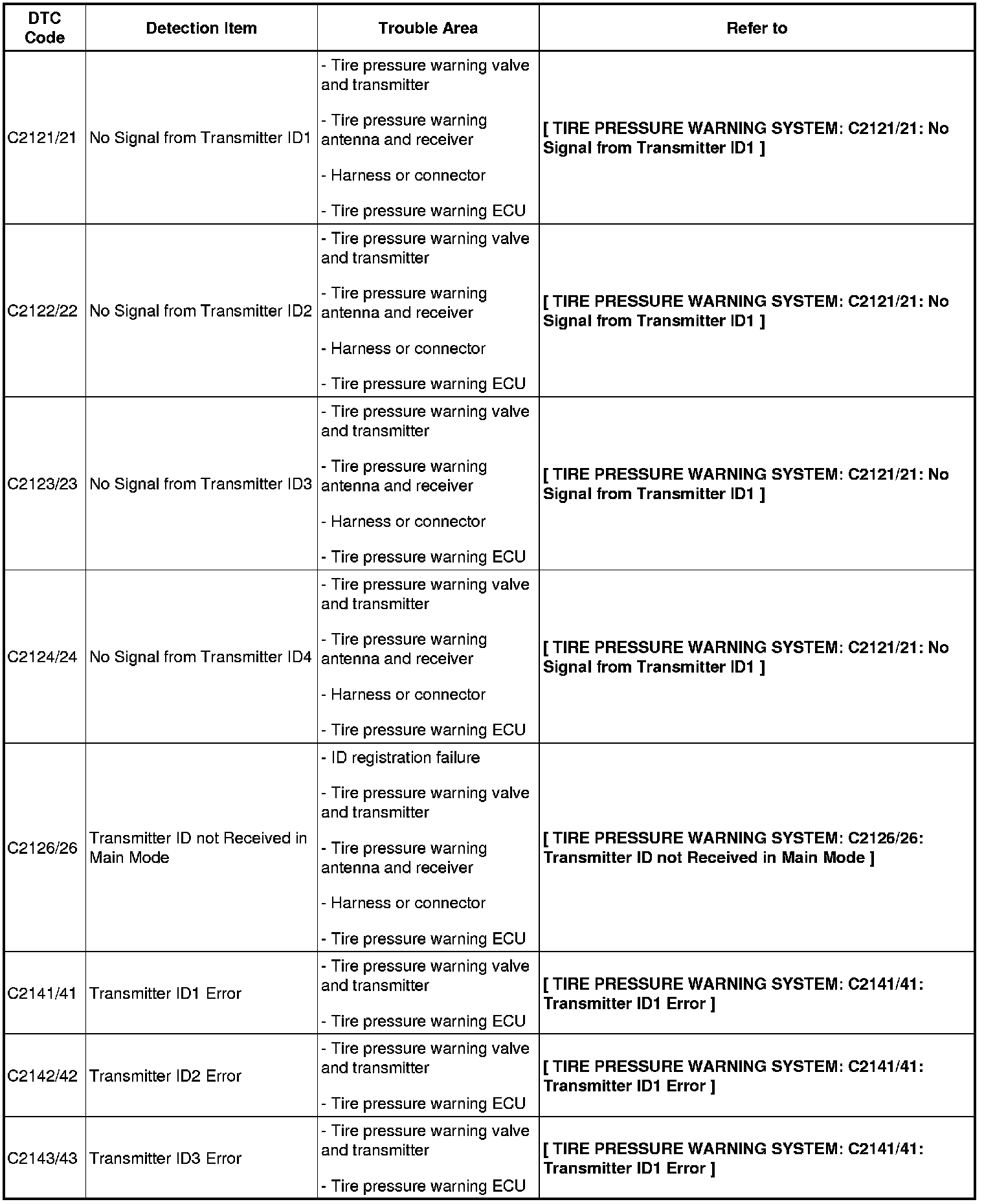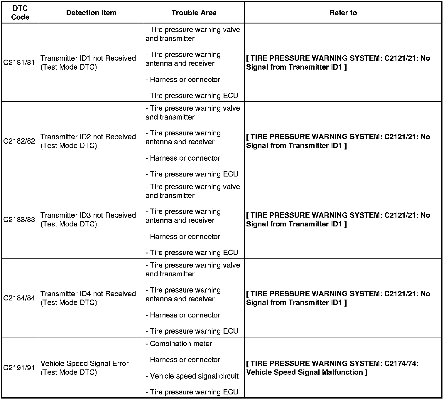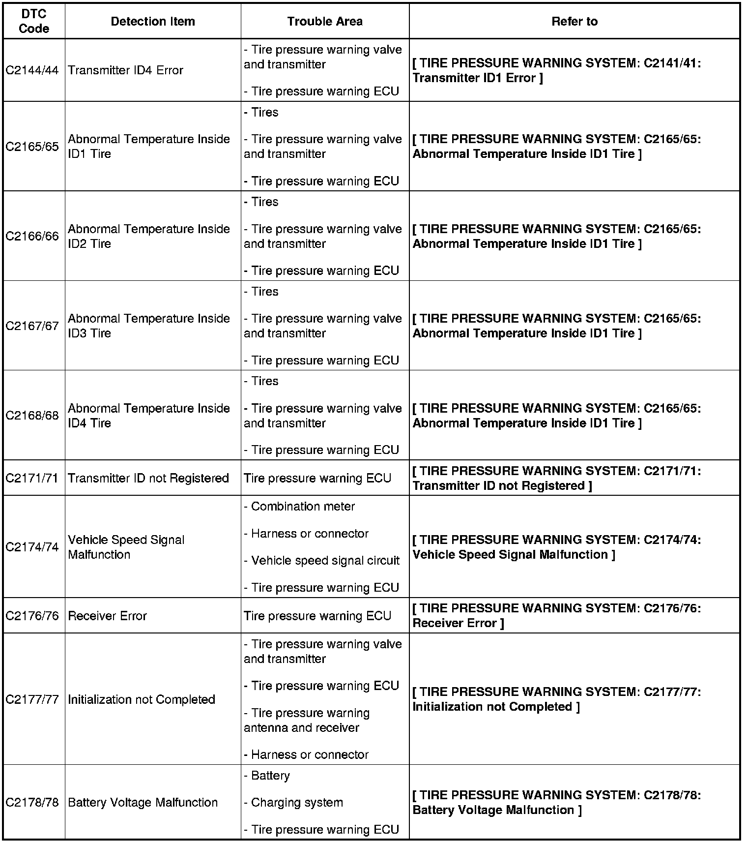 TIRE AND WHEEL: TIRE PRESSURE WARNING SYSTEM: DIAGNOSTIC TROUBLE CODE CHART