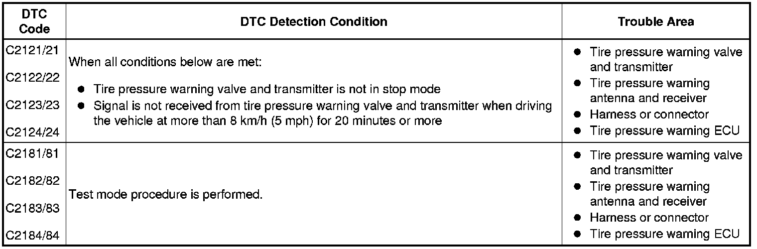 DTCs from C2121/21 to C2124/24 can only be cleared by using the tester or receiving the signal from the tire pressure warning valve and transmitter. DTCs from C2181/81 to C2184/84 can be cleared when the transmitter in the tire pressure warning valve and transmitter sends a forced transmission signal or test mode ends. DTCs from C2181/81 to C2184/84 are output only in test mode.