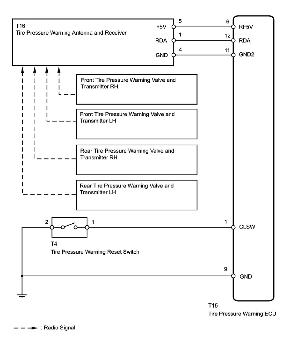 The tire pressure warning valves and transmitters that are installed in the tire and wheel assemblies measure the air pressure of the tires. The measured values are transmitted to the tire pressure warning antenna and receiver on the body as radio waves and then sent to the tire pressure warning ECU. The ECU compares the measured air pressure values with the air pressure threshold. When the measured air pressure value is less than this threshold, the warning light in the combination meter turns on.