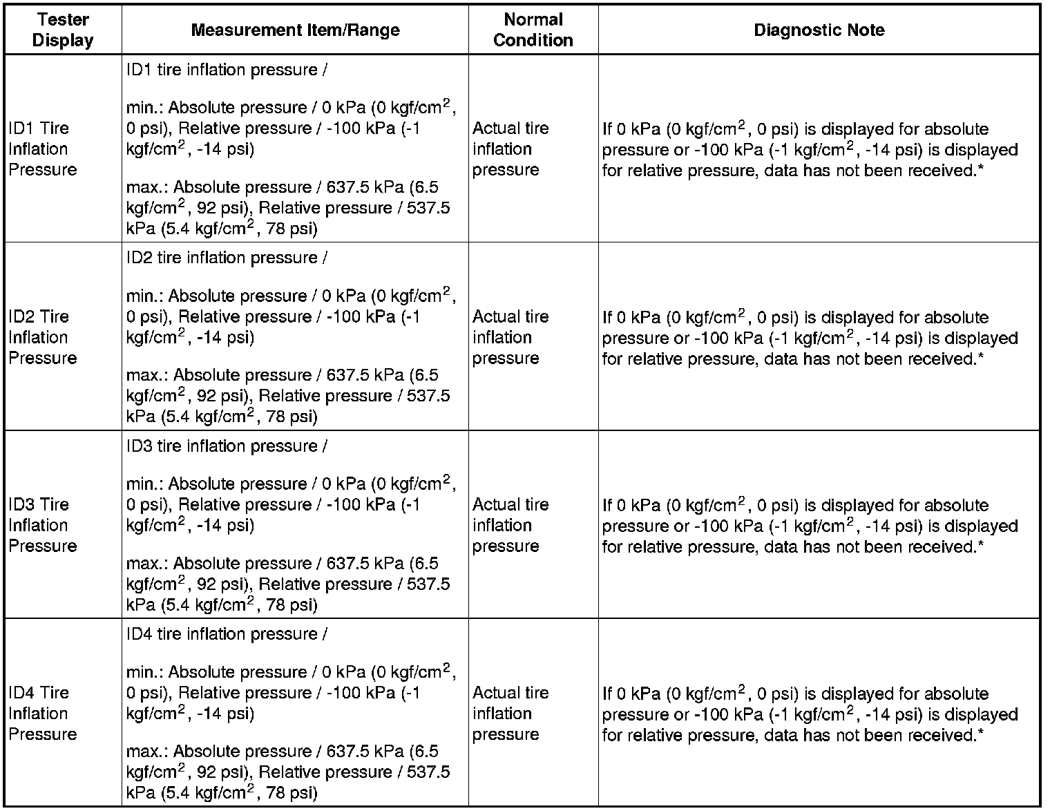 - Record the "ID Tire Inflation Pressure" data transmitter ID that corresponds to each tire.