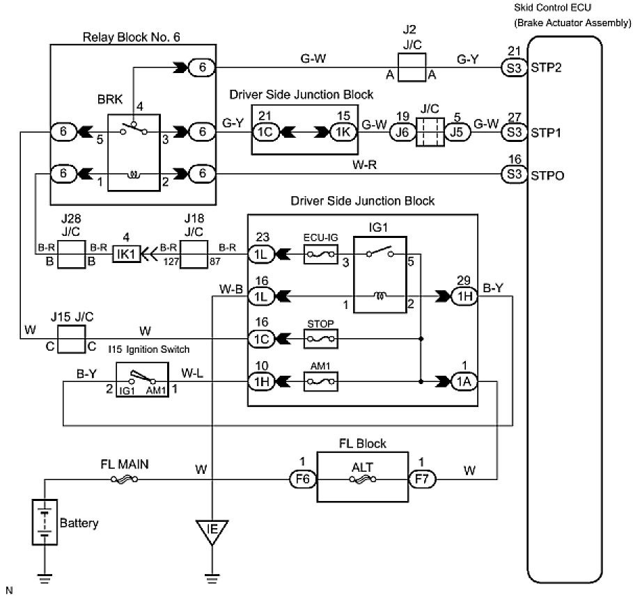 The skid control ECU (brake actuator assembly) operates the brake actuator and illuminates the stop light by operating the BRK relay at the same time.