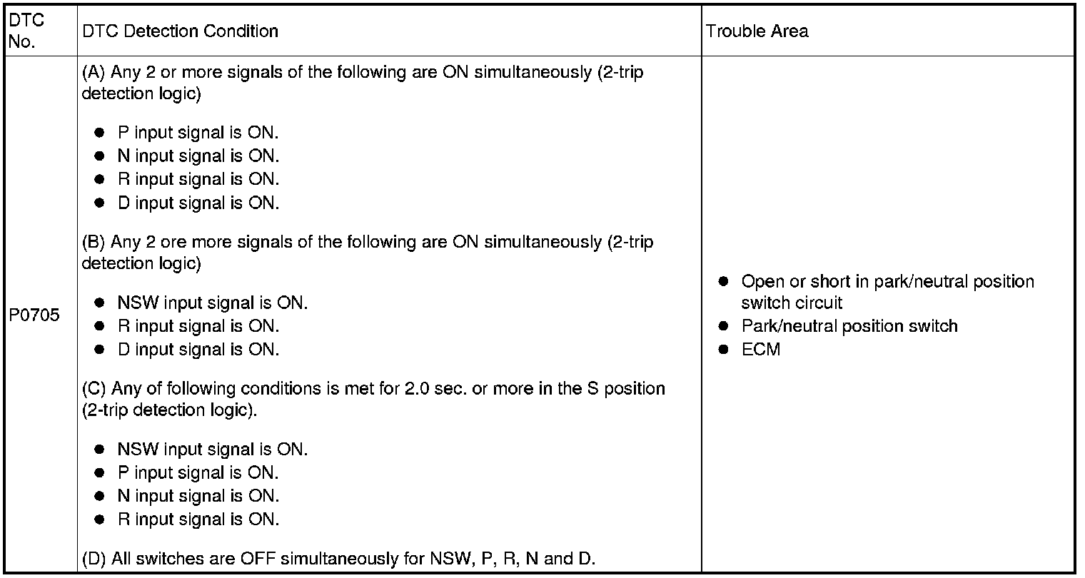 2GR-FE ENGINE CONTROL SYSTEM: SFI SYSTEM: P0705: Transmission Range Sensor Circuit Malfunction (PRNDL Input)