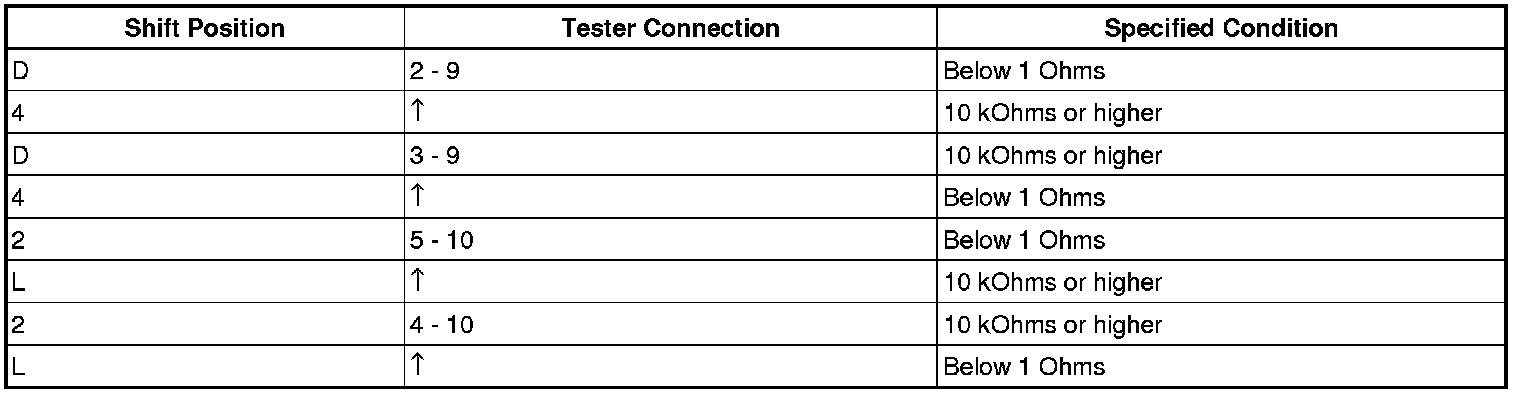 (b) Measure resistance according to the value(s) in the table below when the shift lever is moved to each position.