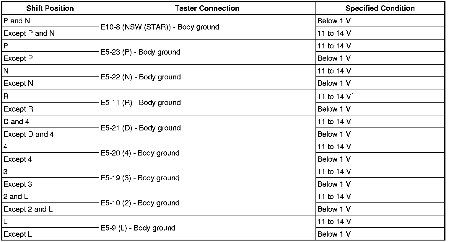 (b) Turn the ignition switch to the ON position, and measure the voltage according to the value(s) in the table below when the shift lever is moved to each position.