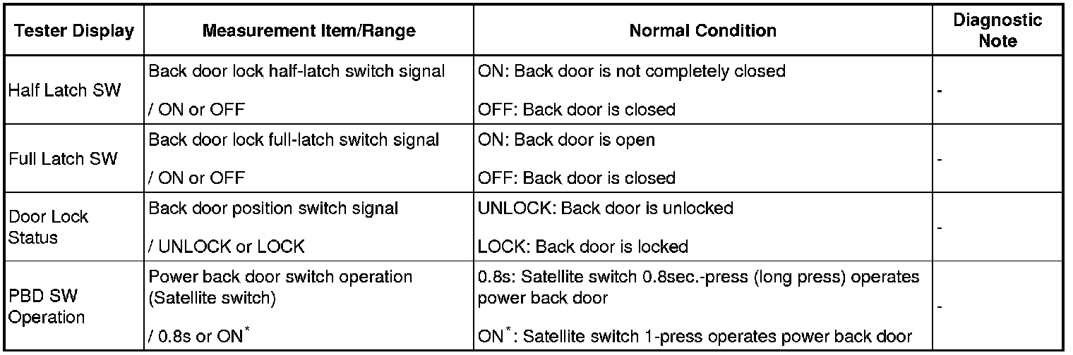 * "ON" appearing on the display of the Techstream means that a 1-press of the satellite switch operates the power back door.