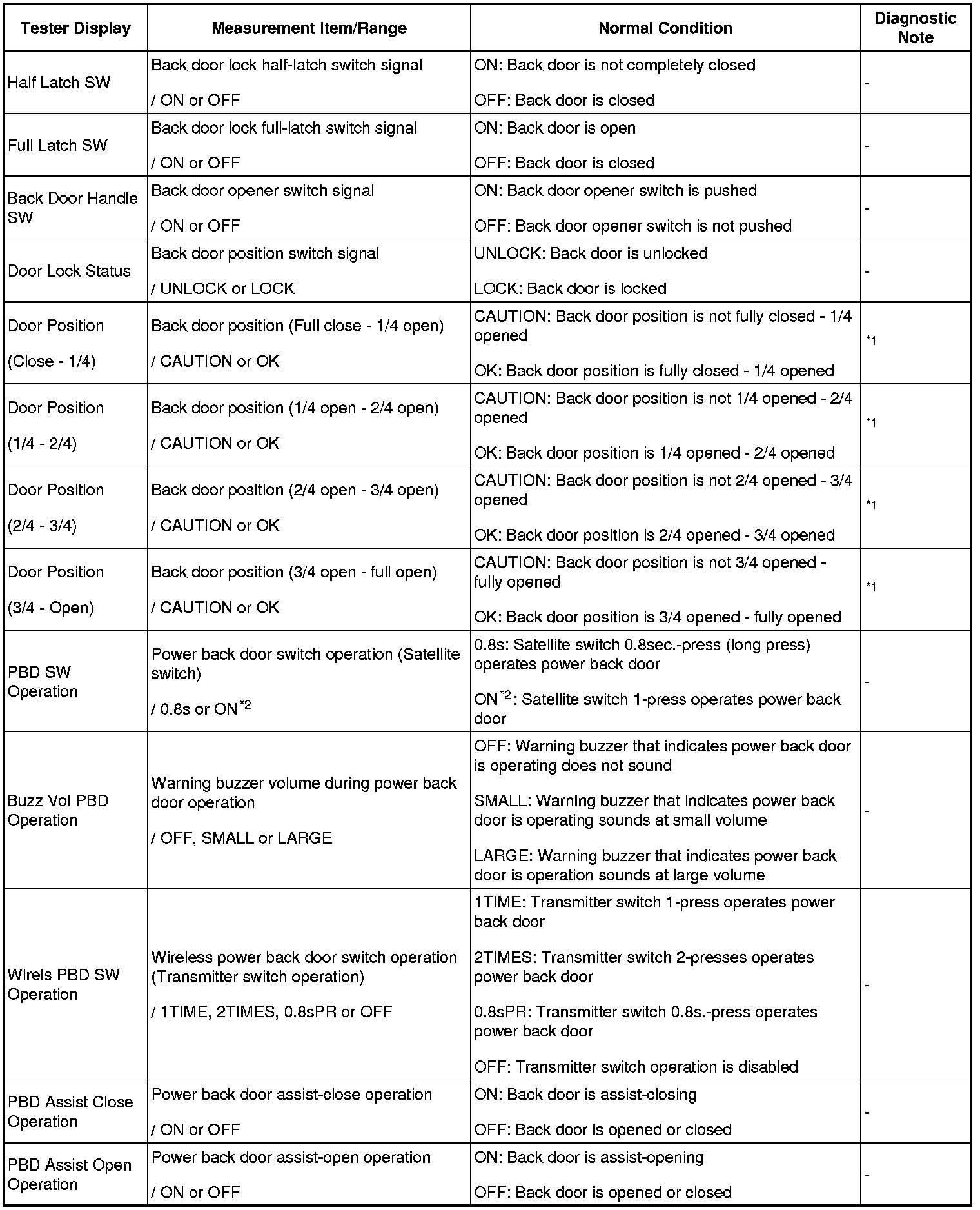 *2 "0.0s" appearing on the display of the Techstream means that a 1-press of the satellite switch operates the power back door.