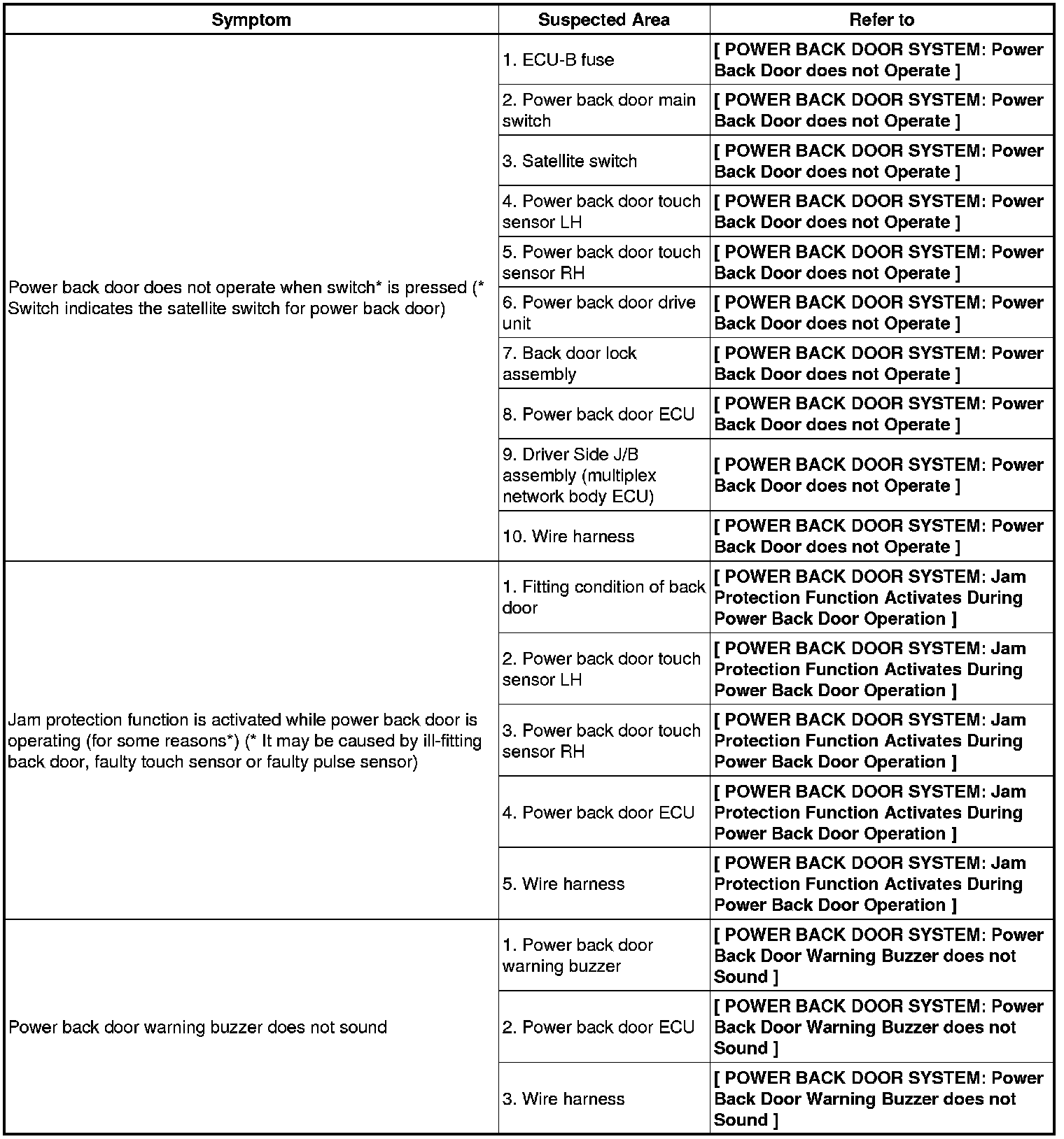 / DOOR: POWER BACK DOOR SYSTEM: PROBLEM SYMPTOMS TABLE