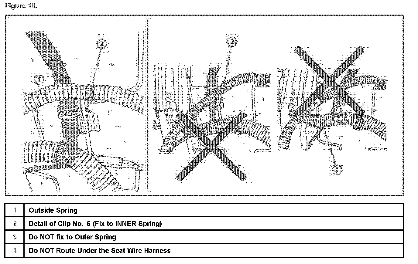 C. Using Figures 12 through 18 remove the original wire harness while routing the new wire harness and attach the 6 retaining clips to the seat frame.