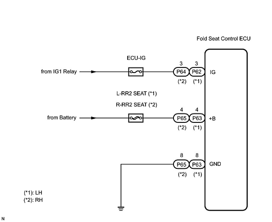 Power is supplied to the fold seat control ECU through the L-RR2 SEAT and R-RR2 SEAT fuses.