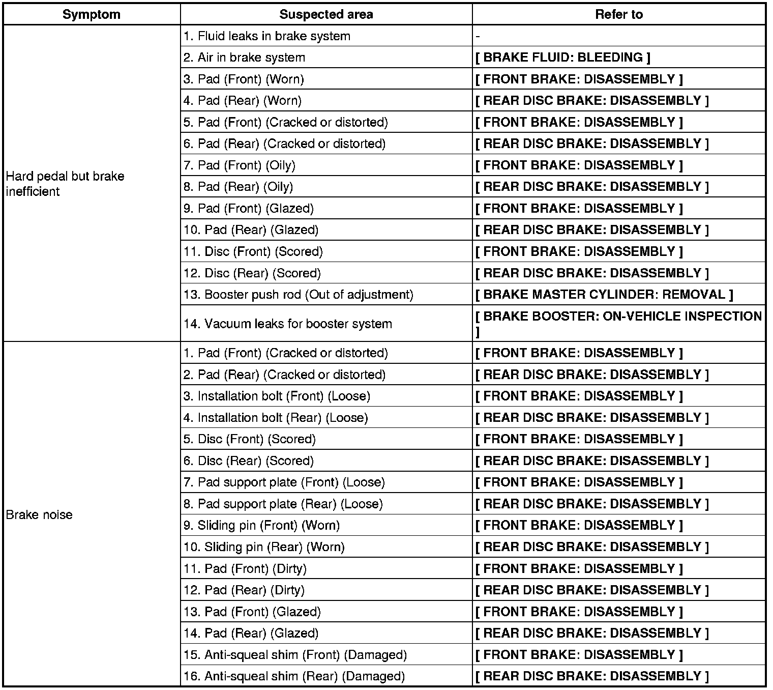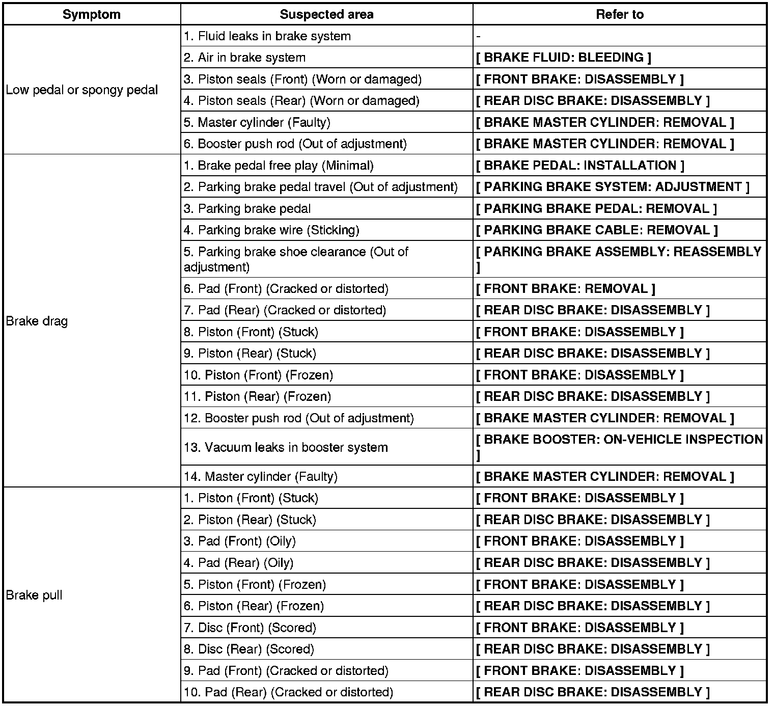 BRAKE: BRAKE SYSTEM: PROBLEM SYMPTOMS TABLE