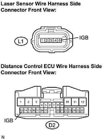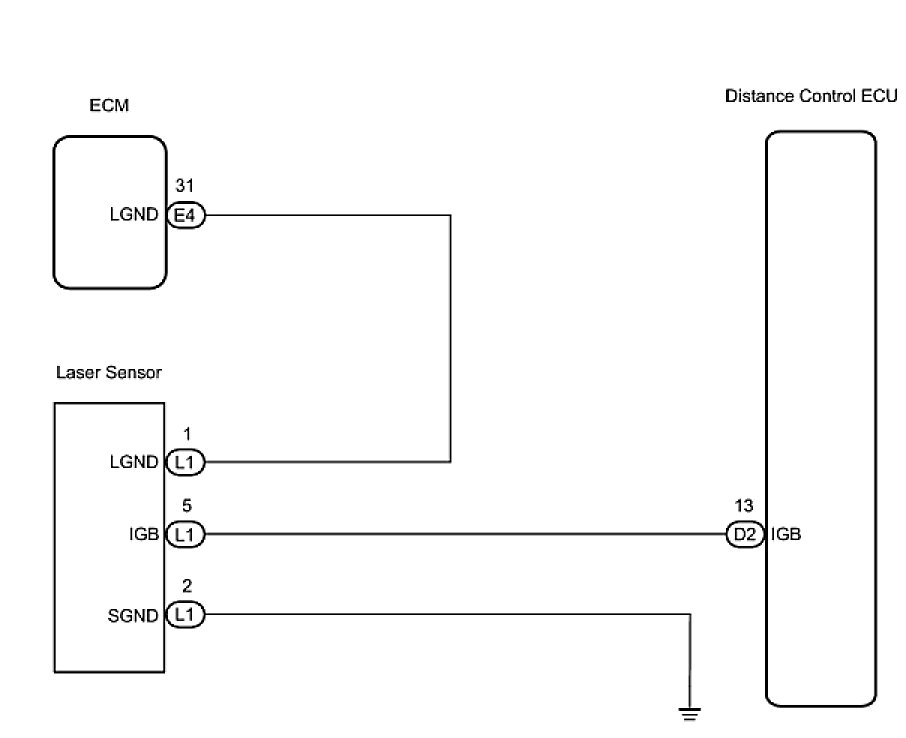 This circuit provides power to the laser sensor. The laser sensor emits radio waves towards an object in front and measures the distance and direction of the object by receiving the beam reflections. Based on the reflections, the sensor calculates the difference in speed between the vehicle and the object in front. This data is transmitted to the distance control ECU. The ECM recognizes the laser sensor via terminals LGND. If an open circuit occurs in the wire harness between terminals LGND, the ECM cannot recognize the laser sensor. The ECM will stop the control of the vehicle-to-vehicle distance control mode and only the constant speed control mode can be used.