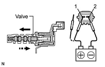 (1) Connect the positive (+) lead from the battery to terminal 1 and connect the negative (-) lead to terminal 2, and check the movement of the valve.
